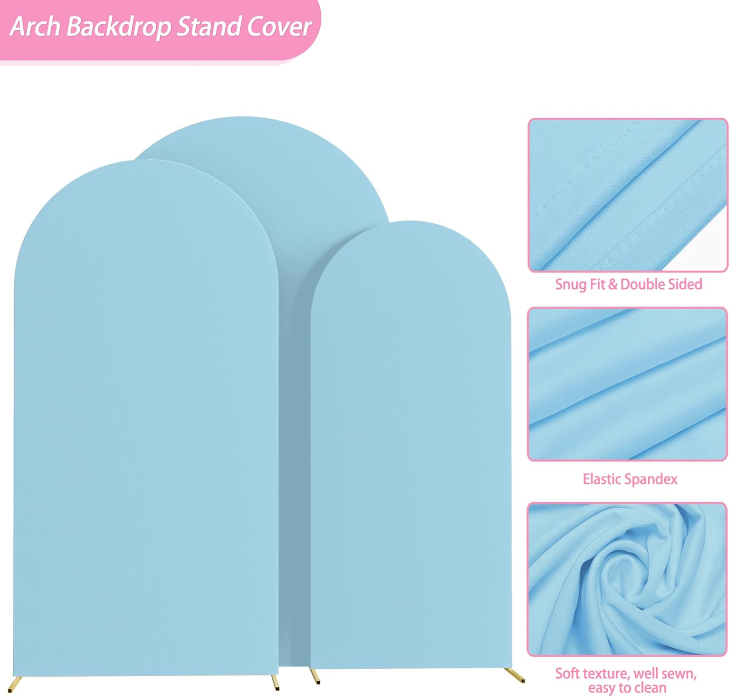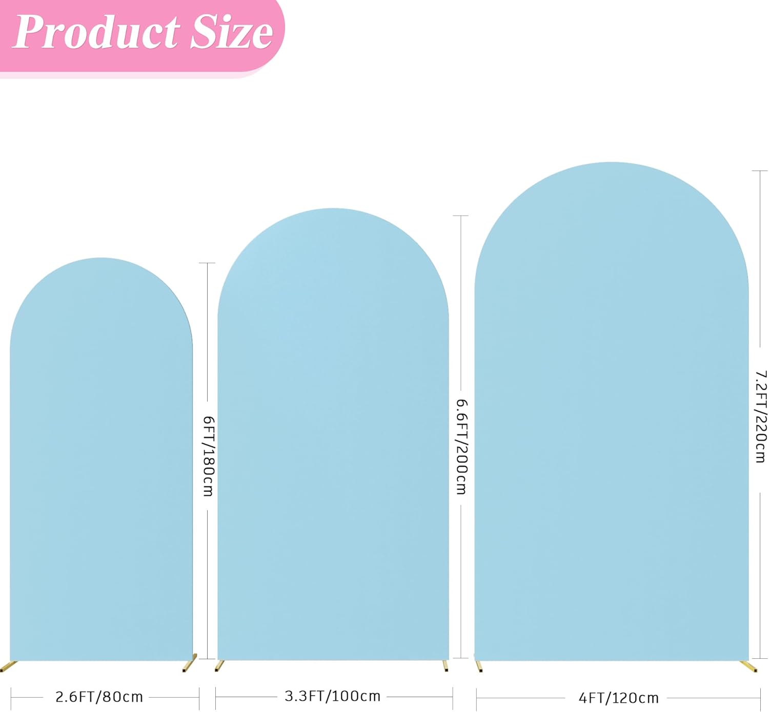 - 【Package Includes】There is a Dusty Blue 6FT x 2.6FT, 6.6FT x 3.3FT and 7.2FT x 4FT spandex arched backdrop cover in the package. Note: the elasticity of spandex fabric may create some dimensional errors and may be some light transmission in sunlight. And due to the flexible, it is simple to use and like putting a pillowcase over a pillows. If you have any questions about our products, please feel free to contact us.