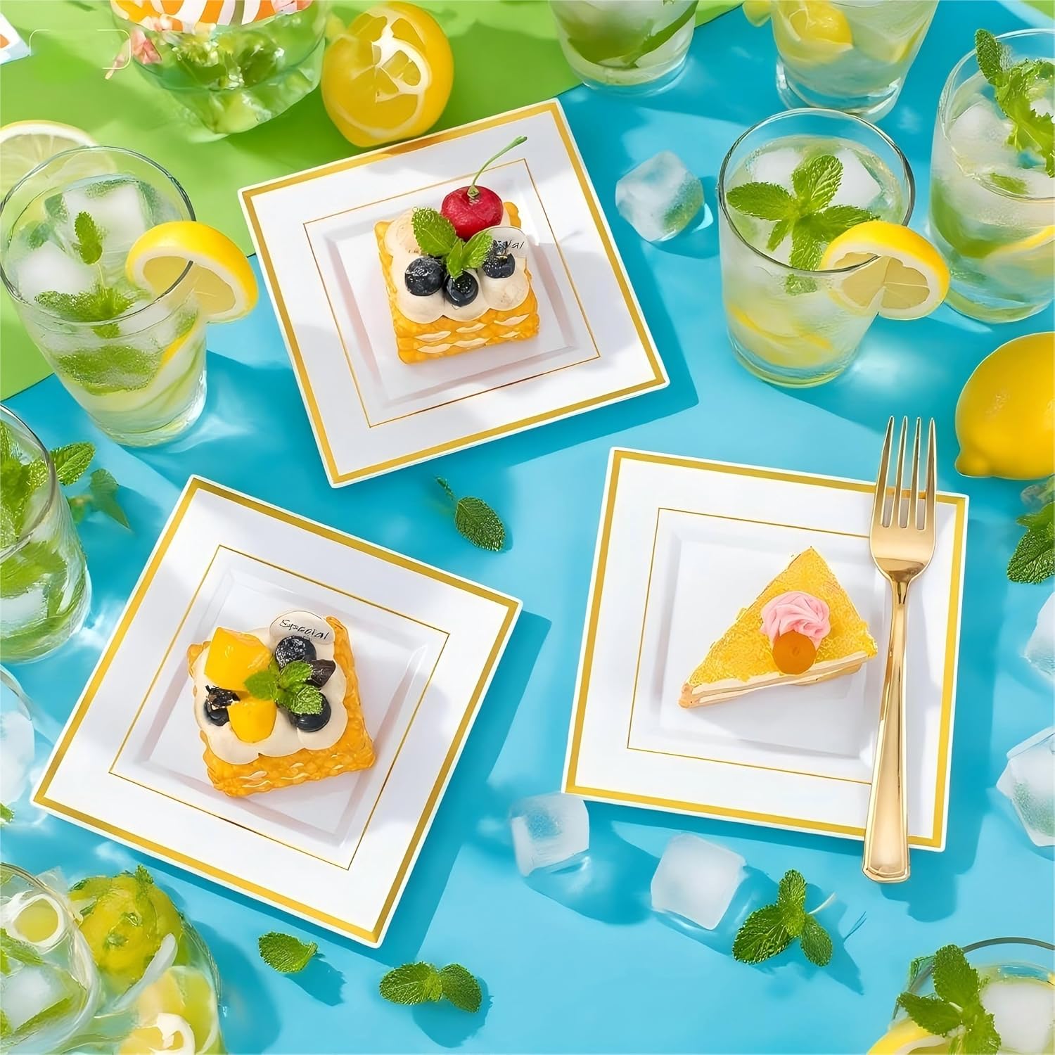 - GOLDEN EDGE DESIGN:Our 50 Serving gold plastic plates feature an eye-catching gold rimmed design that adds a sense of luxury and sophistication to your special occasions, and these gold square plastic plates make your table shine.