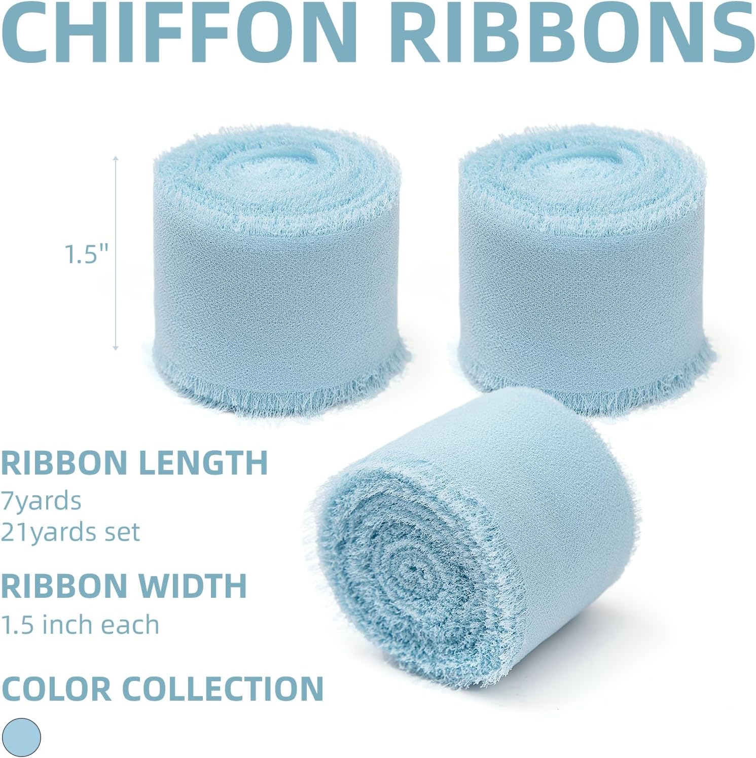 3 Rolls Light Blue Handmade Chiffon Ribbon,1.5" x 21Yd Frayed Fringe Silk Ribbons (3 Rolls *7Yd) for Gifts Wrapping, Wedding Invitations, Bridal Bouquets, Decorations