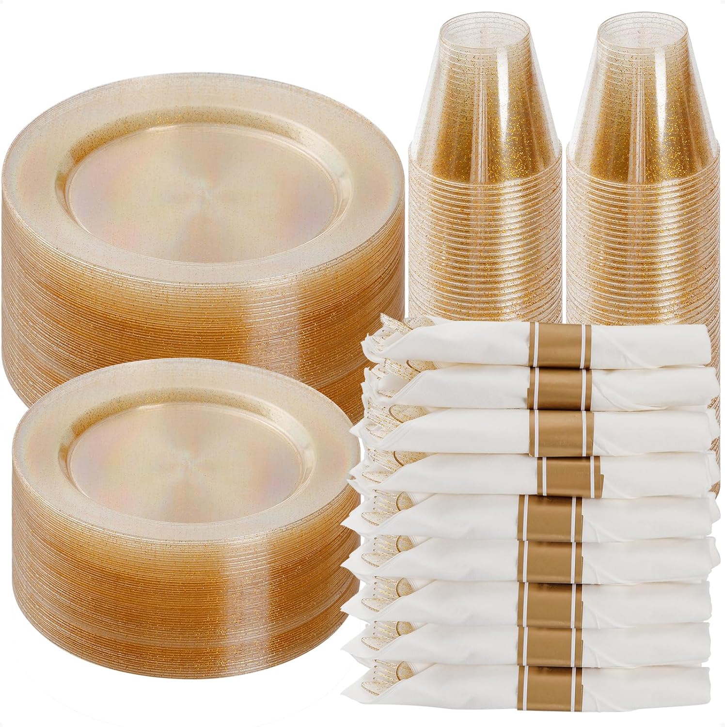 Goodluck 350 Piece Gold Glitter Plastic Dinnerware Set for 50 Guests, Disposable Plates for Party, Include: 50 Dinner Plates, 50 Dessert Plates, 50 Rolled Napkins with Silverware, 50 Cups