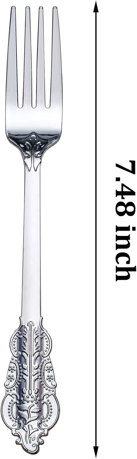 - BRIGHT COLOR: The end of the silver forks disposable have a โBaroqueโ design, and these silver plastic forks can make your table decoration more elegant. WDF silver forks are colored using a special technique, which is not only bright but also does not fade. Pairing these silver plastic silverware with carefully prepared food is a visual enjoyment.