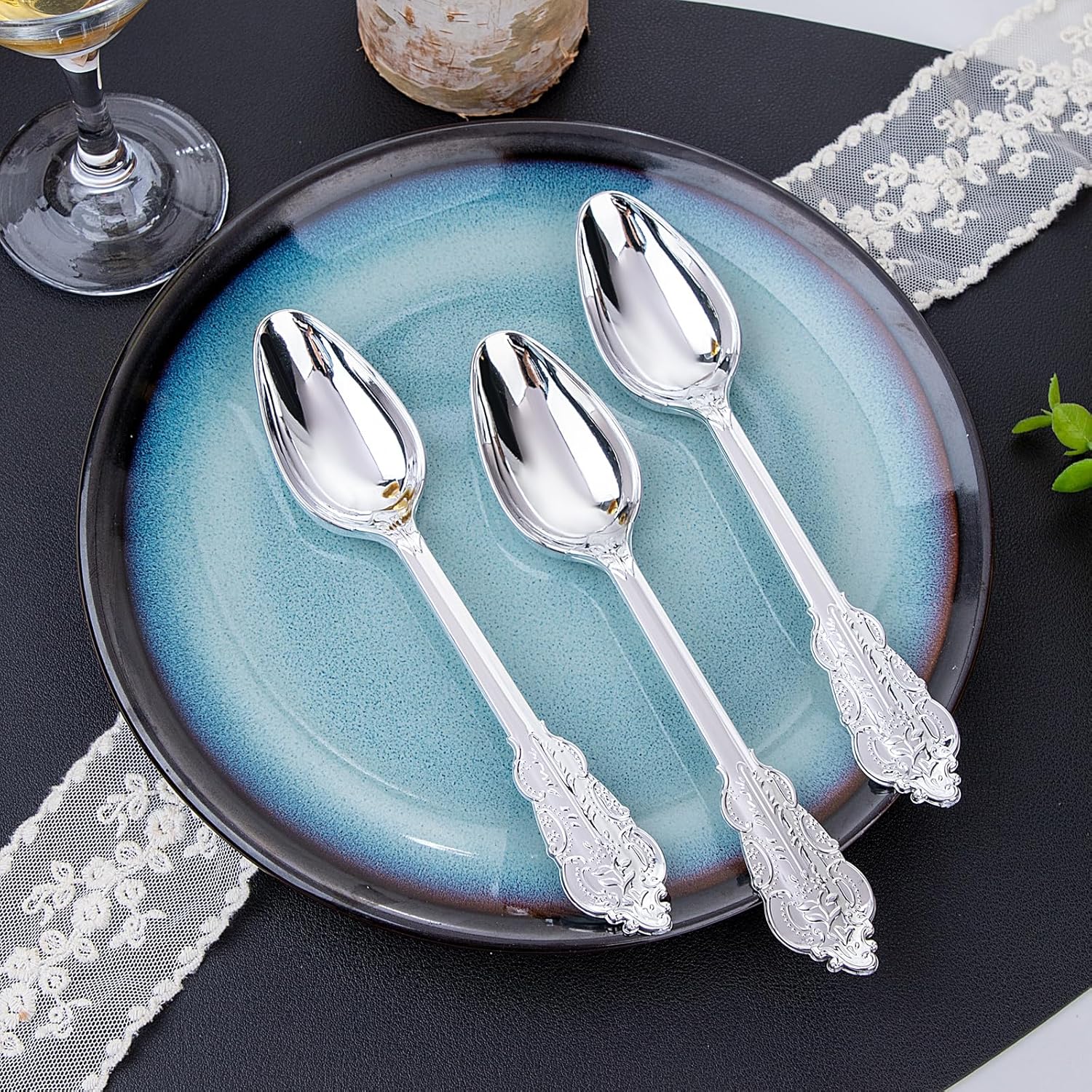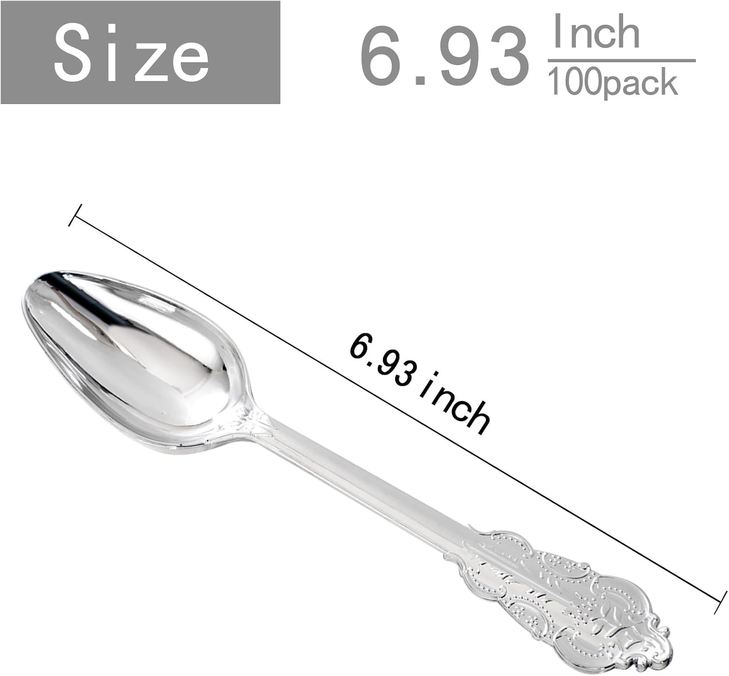 WDF 100 Piece Silver Plastic Spoons Disposable - 6.93 Inch Baroque Silver Silverware for Dessert Cake - Heavy Duty Plastic Spoons for Christmas Party, Wedding or Daily Using