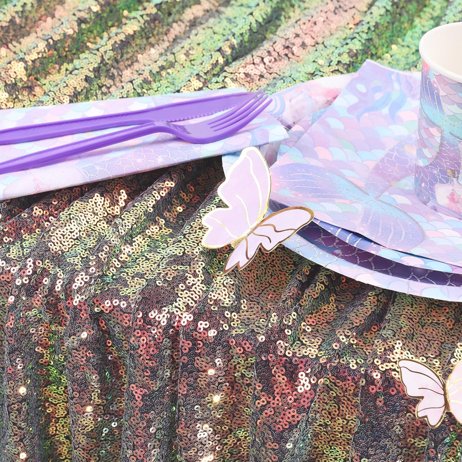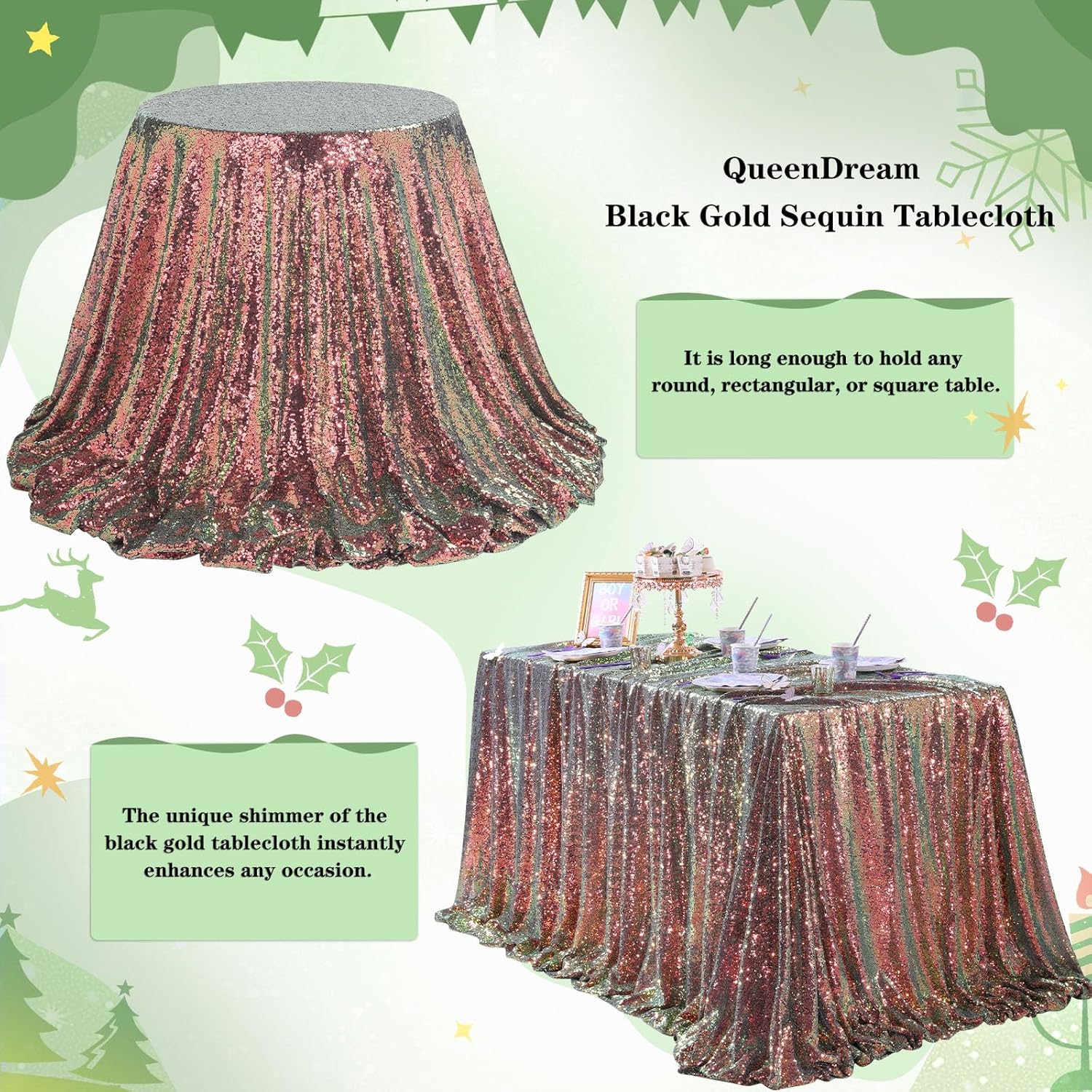 - Sequin Tablecloth Premium Material: This black and gold sequin tablecloth is made of polyester, non-toxic, odorless, and non-fading. Unfold or collapse Black and Gold tablecloth and then enjoy your glittering party.