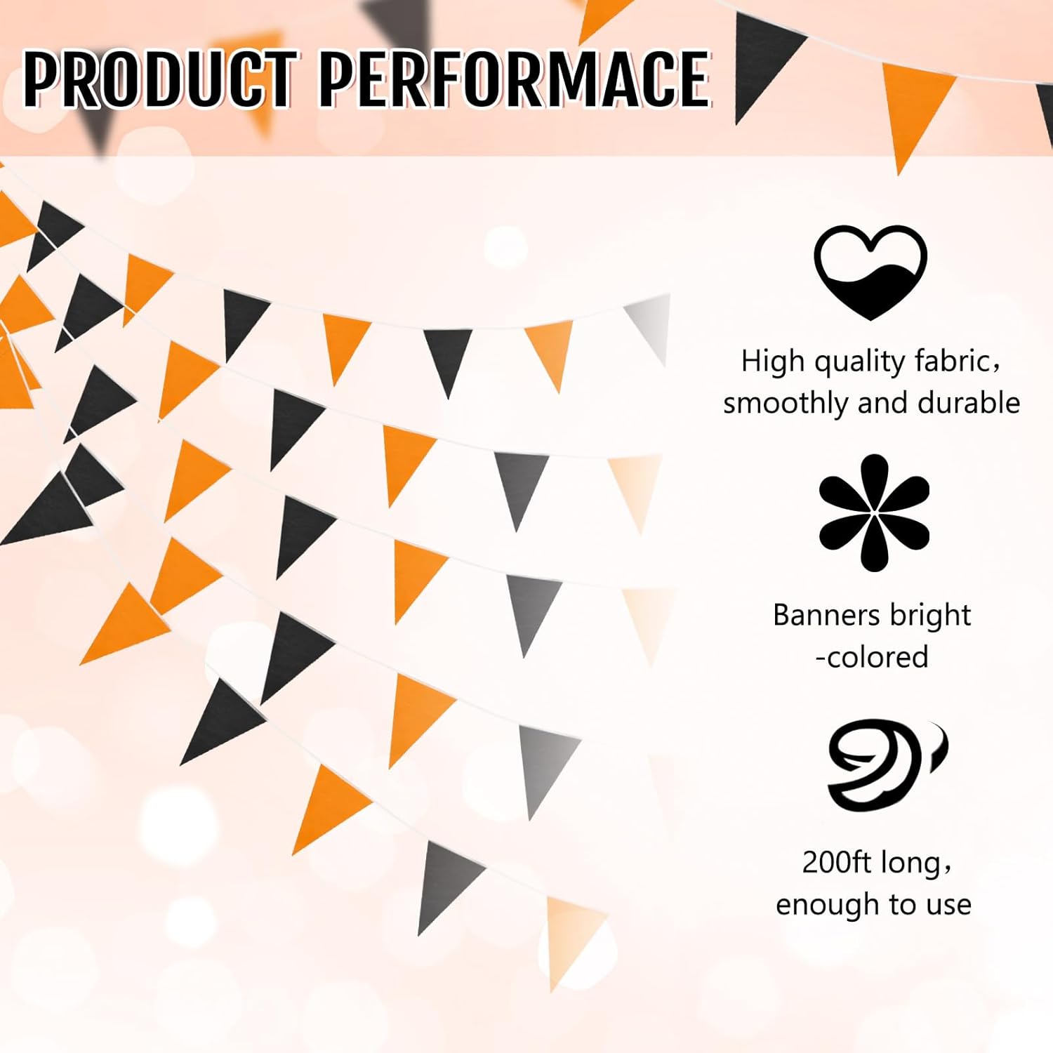 - What You Will Get: you will get 1 string of banner party decoration, about 200 ft/ 60 m in length, long enough so that you can hang it in most places you want; And also it is equipped with 120 triangle flags, which are available in orange and black, measuring about 11 x 7 inches/ 30 x 18 cm