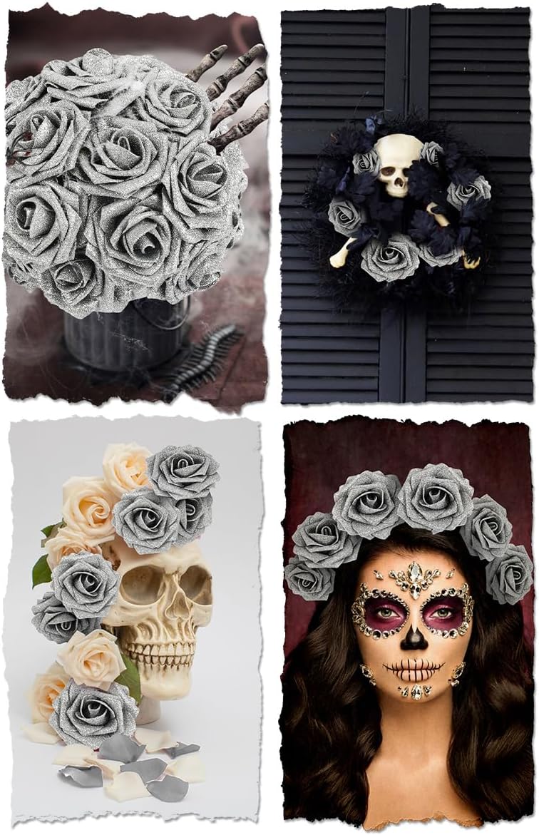 N&T NIETING Artificial Flowers Glowing Silver Flowers Foam 25pcs Glitter Roses Real Looking Fake Roses with Stem for DIY Wedding Bouquets Centerpieces Bridal Shower Party Home Decorations