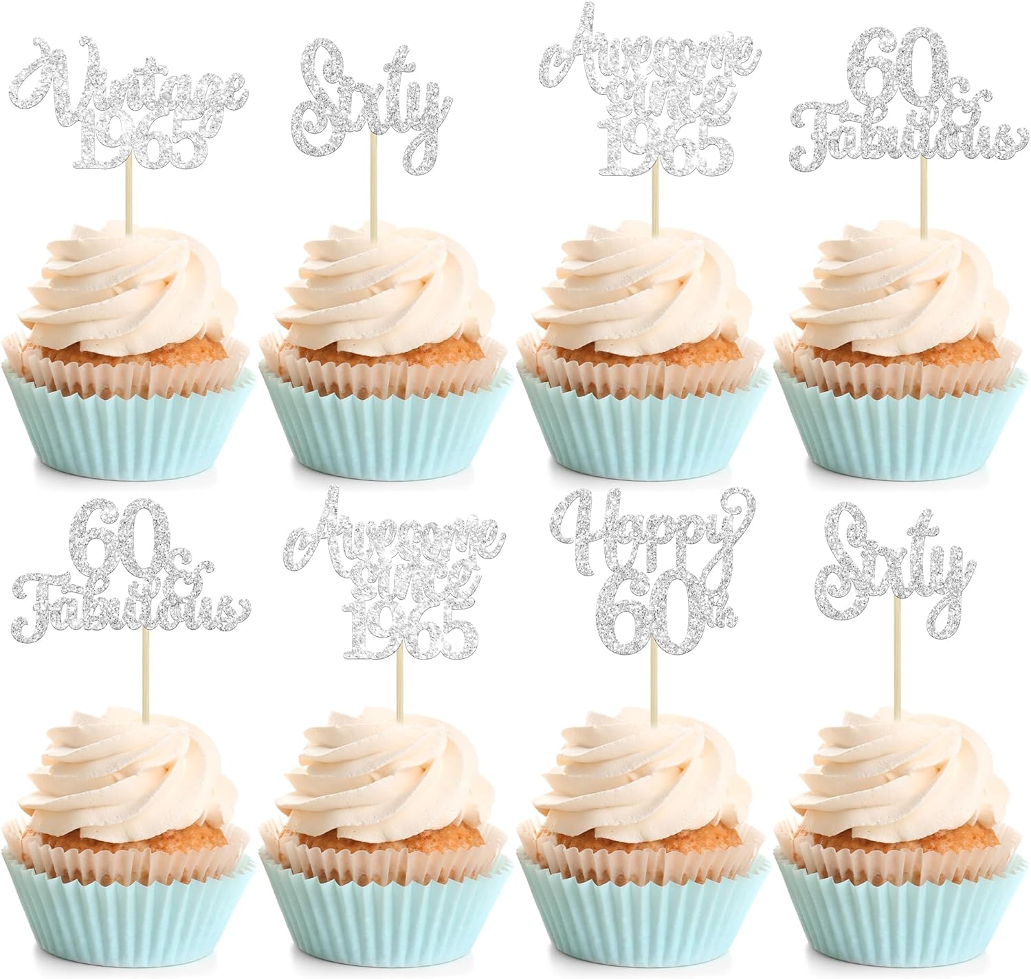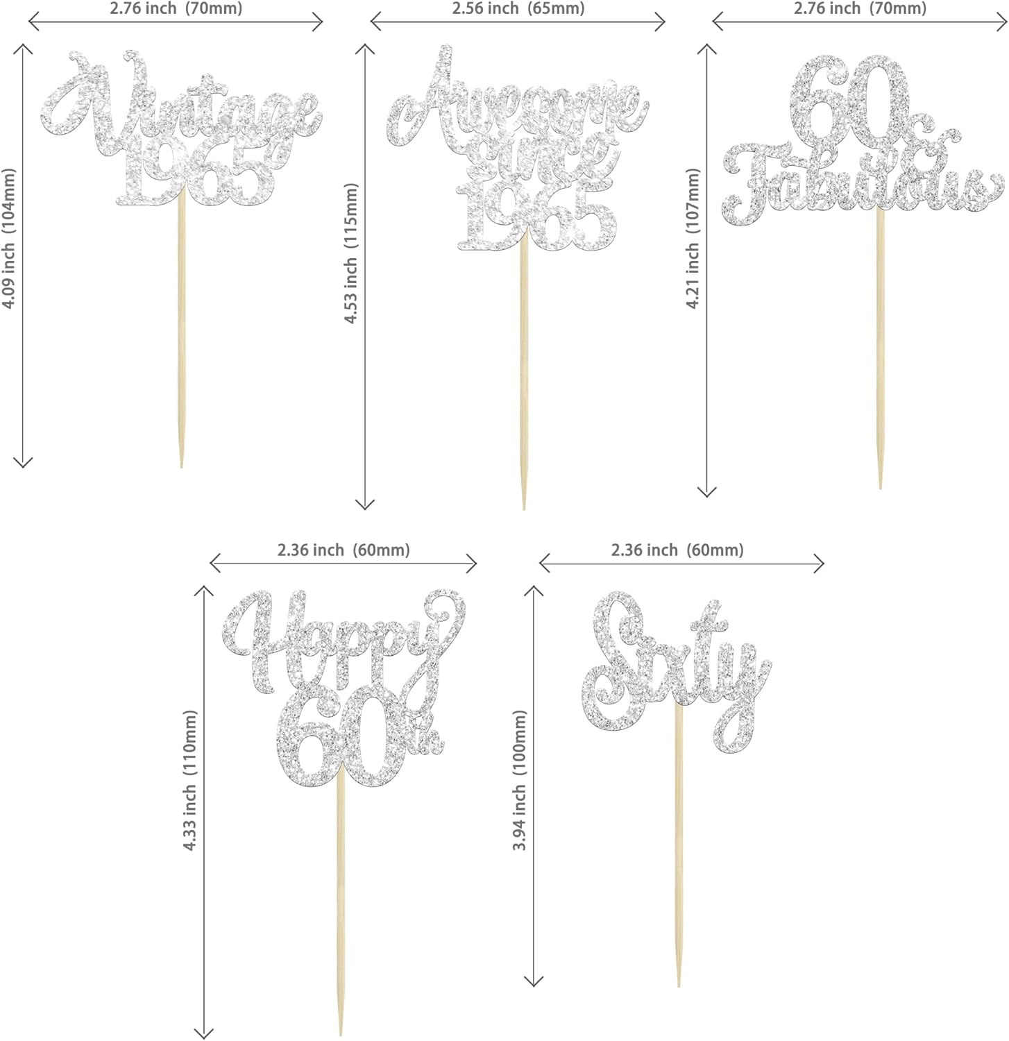30Pcs Happy 60th Birthday Cupcake Toppers Glitter Sixty Vintage 1965 Cupcake Picks Cheers to 60 Fabulous Cake Decorations for 60th Birthday Wedding Anniversary Party Supplies Silver