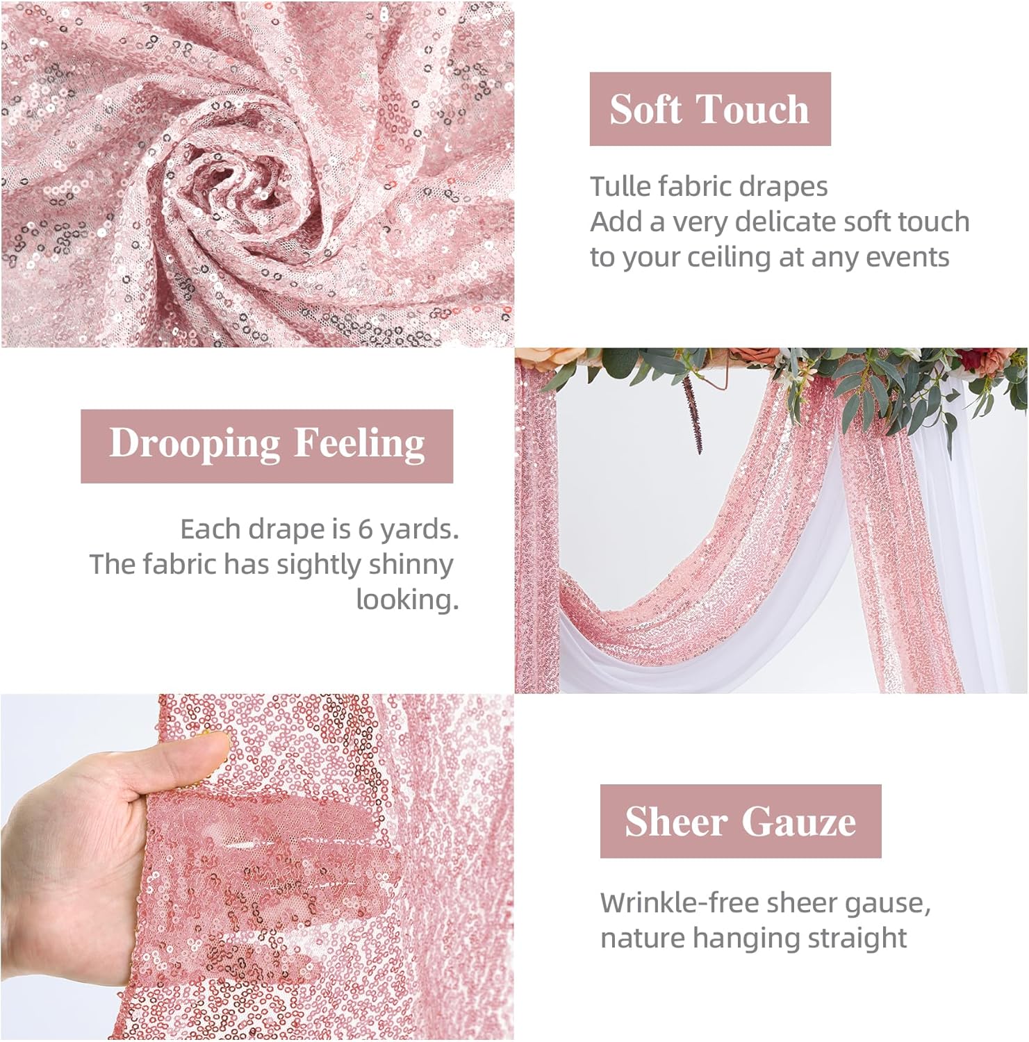- 【Best Choice Wedding Arch】Package includes 2 panels arch drapes.1 panel white sheer arch drapes size is 28 inches wide and 228 inches long, another rose gold sequin drapes size is 16 inches wide and 228 inches long. The length is long enough to fit any size arch decoration. Soft and overhanging pendants make the wedding decorations more popular.This sheer drapery backdrop can help your party to create a warm and elegant scenes.