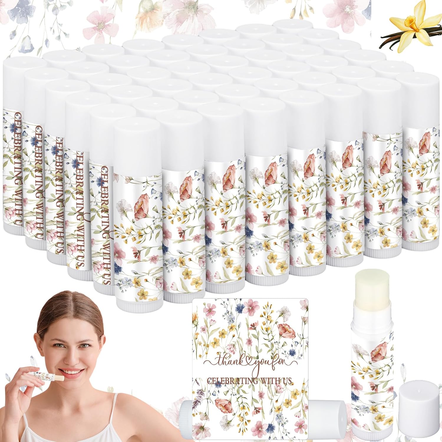 50 Pcs Wildflower Wedding Bridal Shower Gifts Bulk Floral Lip Balm Baby Shower Party Favors Thank You Appreciation Gifts for Women Tea Bachelorette Party