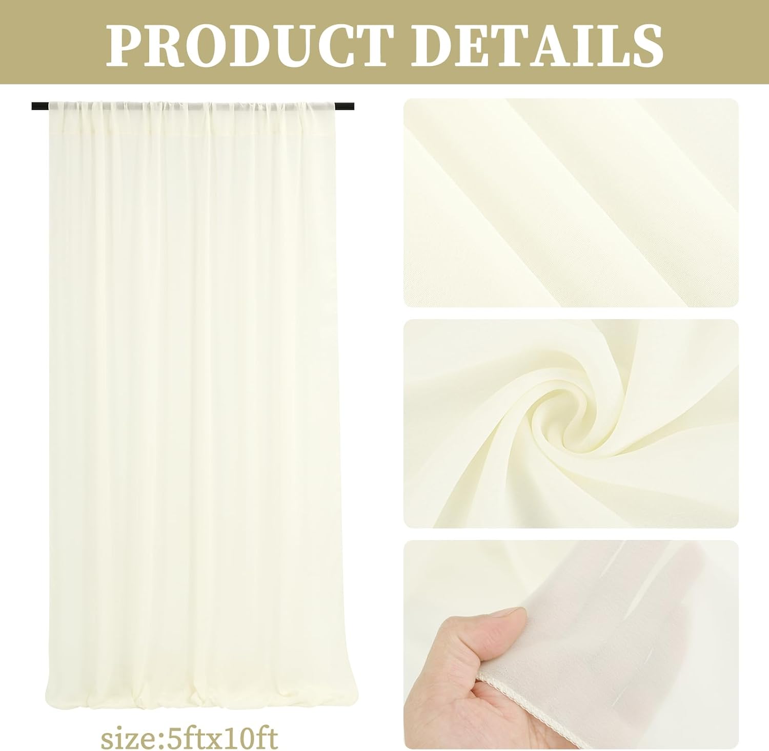 - 🍸【Chiffon Fabric Curtain】The package will include 6 panels ivory wedding drape curtain, each wedding extra long curtain measures 5 feet(60inch)wide x10 feet(120inch) long. Sufficient quantity can meet your needs. These backdrop curtains are applicable for any indoor and outdoor occasion either for decorative or functional uses.(Tips: There is no hook or circle in the package)