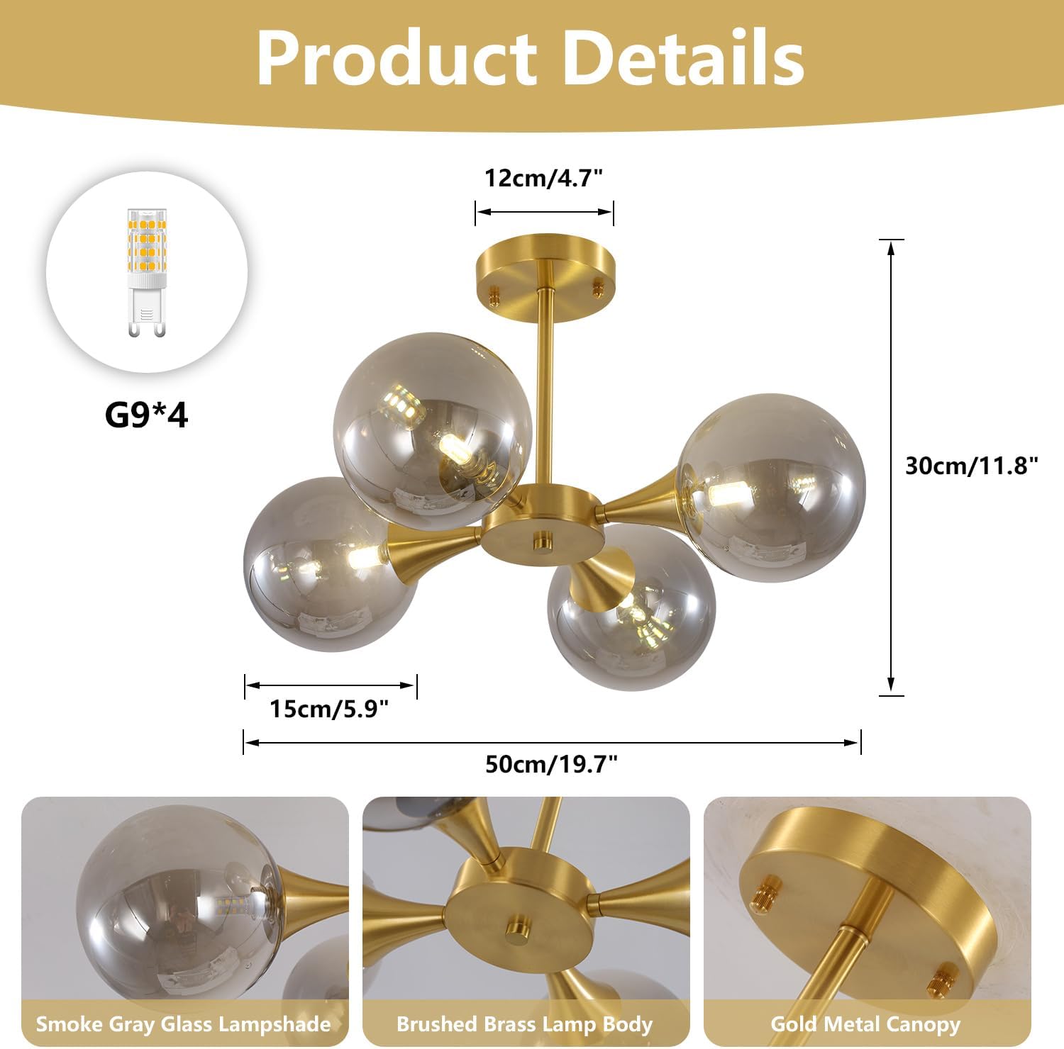 - Ceiling Light Dimension & Bulb Included: The gold metal semi flush mount ceiling light width: 19.7โ(50cm), height: 11.8โ(30cm), globe diameter: 5.9โ(15cm), canopy: 4.7โ(12cm). Light source: G9, voltage: 110-240V for worldwide. The small semi flush mount light itself is not dimmable, but this sputnik flush mount ceiling light can be dimmable when use with dimmable bulb and dimmable switch