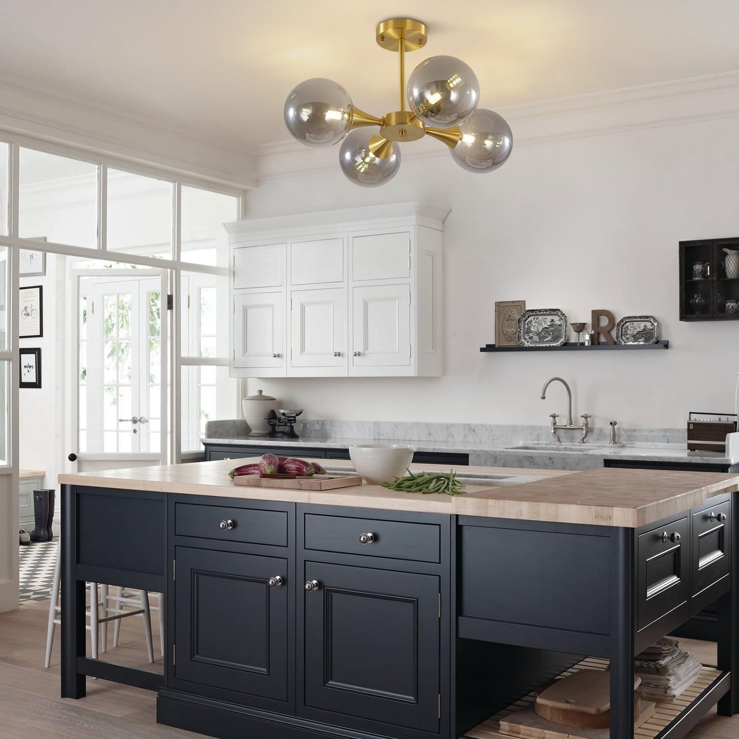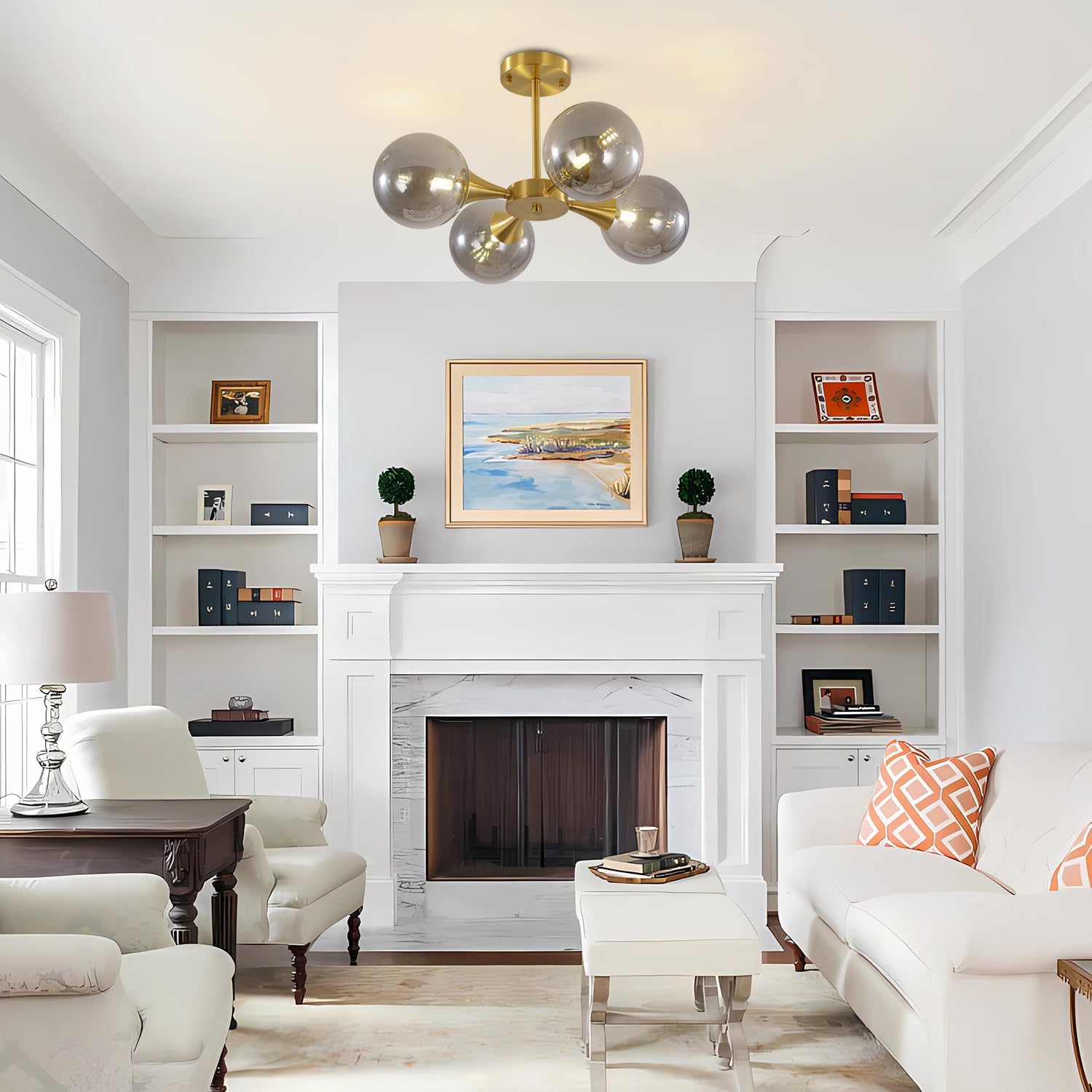 - Modern Globe Chandelier Ceiling Light: The brass ceiling mount light fixture consists of 4 brushed brass metal branches, each with smoke gray glass lampshade, provide comfortable and sufficient lighting in the room where it is placed. The brass gold hall ceiling light will creating mid-century modern style and simple look in your interior room