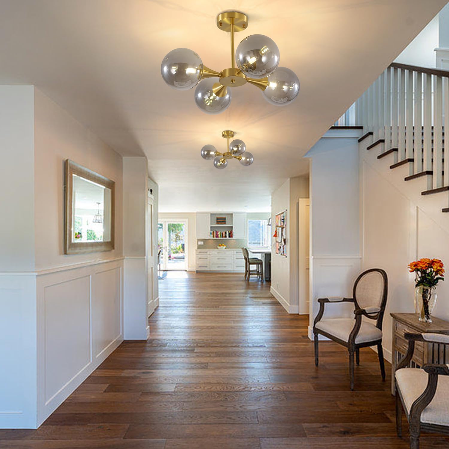 - Perfect for Low Ceiling & Easy Installation: globe branches chandelier ceiling light removing cumbersome design, semi flush mount can be easily embedded on most occasions, perfect fit with any ceilings, from high ceilings to low ceilings. The installation is super easy, just loosen the lock ring and finish lamp body installation, then rotate the glass globe to finish the lampshade installation
