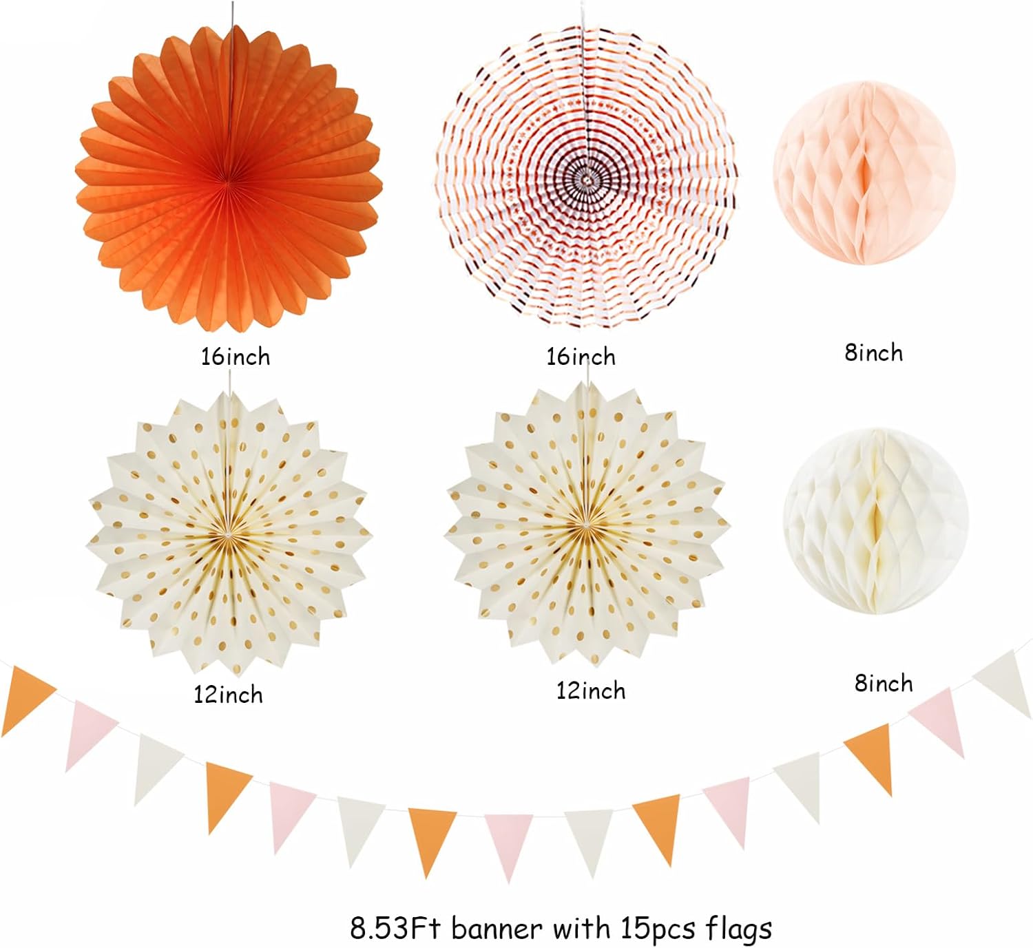 - [Package Includes] Beige orange peach pink fall boho hanging party decorations kit contains: 1 x triangle bunting, 4 x paper fans, 9 x tissue pom poms, 2 x honeycomb balls, 4 x paper lanterns, a total of 20 pieces of various sizes of decorations. Better embellish your party.