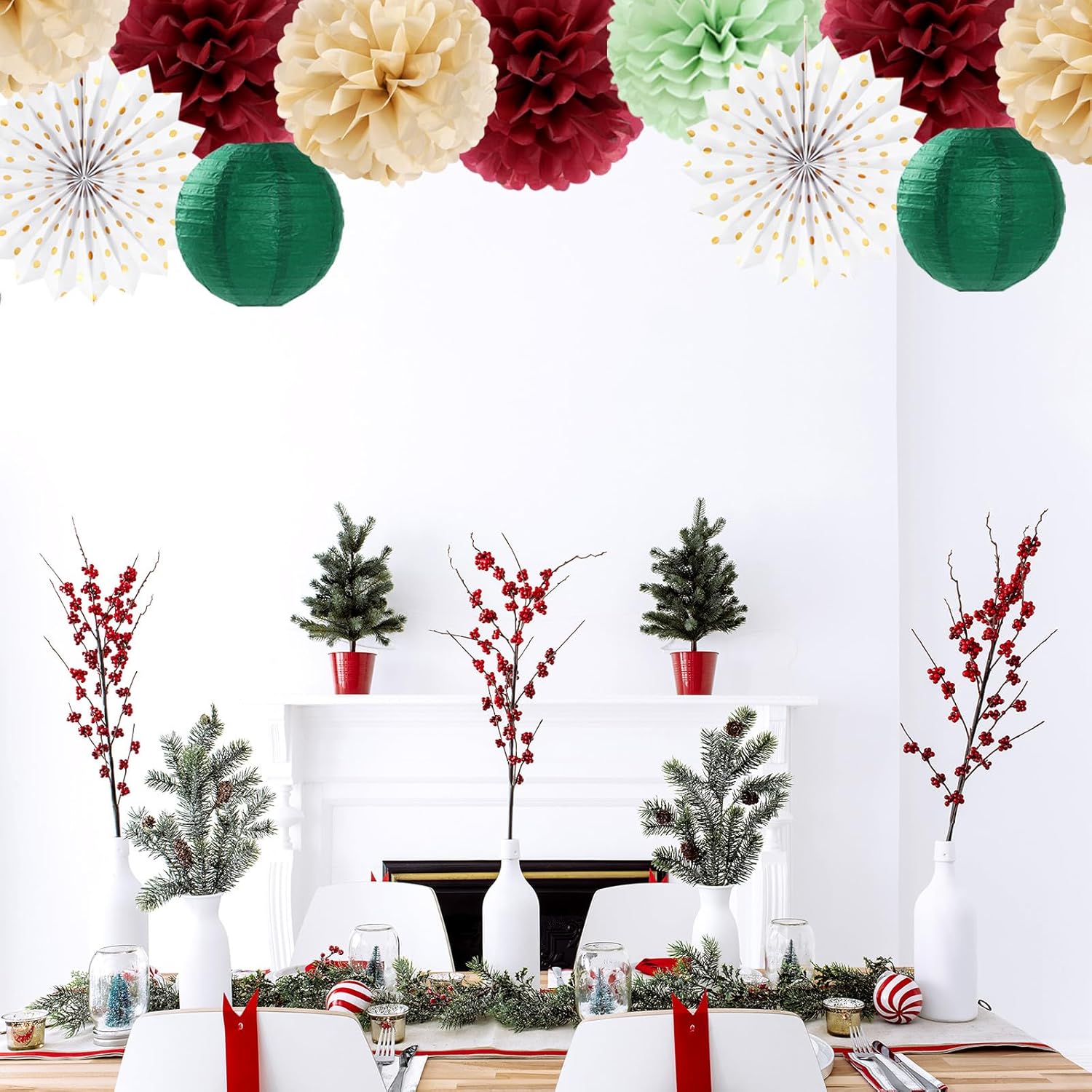 - [Package Includes] Sage olive green burgundy champagne boho party decorations kit contains: 1 x triangle bunting, 4 x paper fans, 9 x tissue pom poms, 2 x honeycomb balls, 4 x paper lanterns, a total of 20 pieces of various sizes of decorations. Better embellish your party.