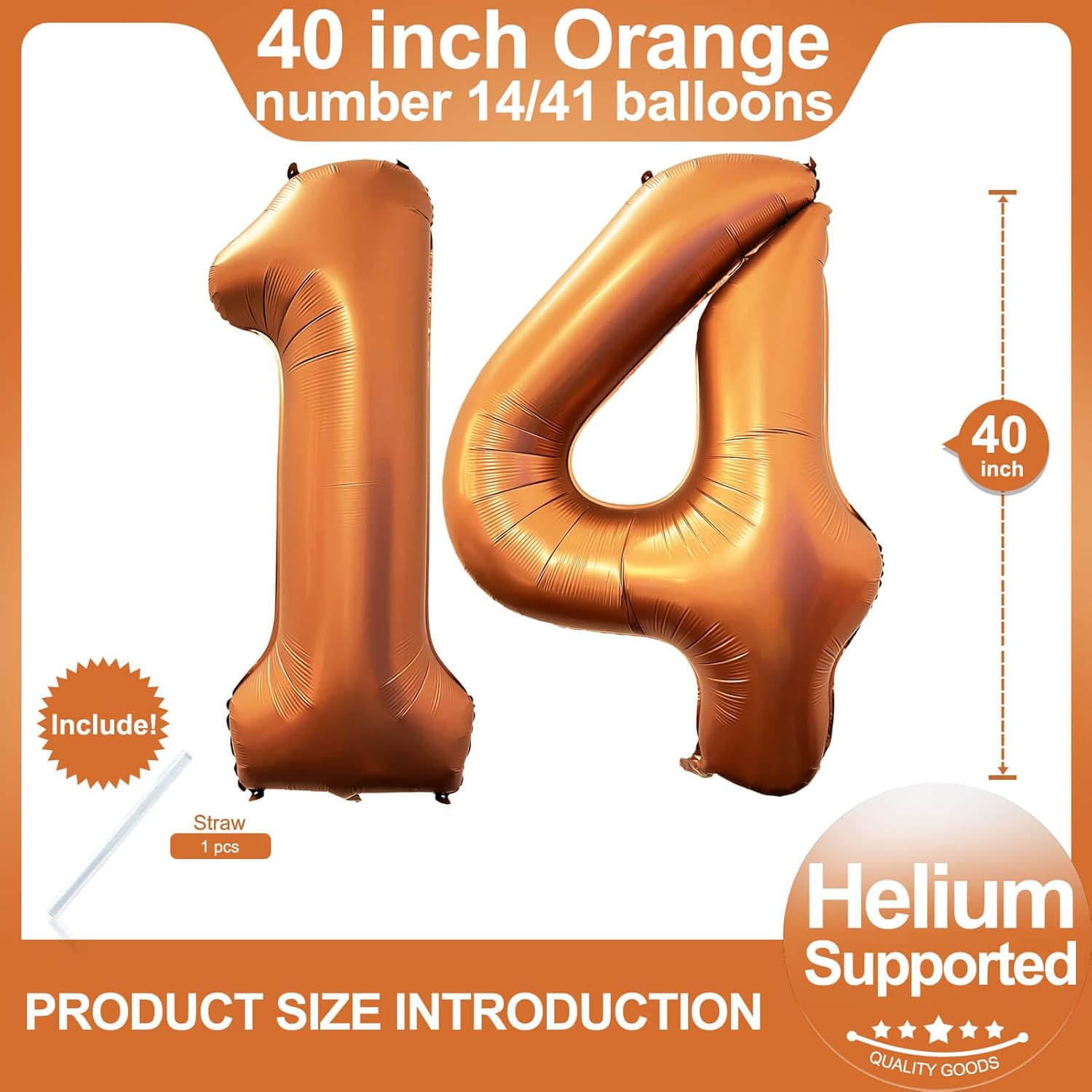 - Package Included:40 inch Orange numbers 1 and 4 (uninflated) + 1 Straw,Orange 14 or 41 number foil digital balloons are the best for 14th or 41st birthday party, wedding celebration, anniversary, ceremories celebration, business or big events party.
