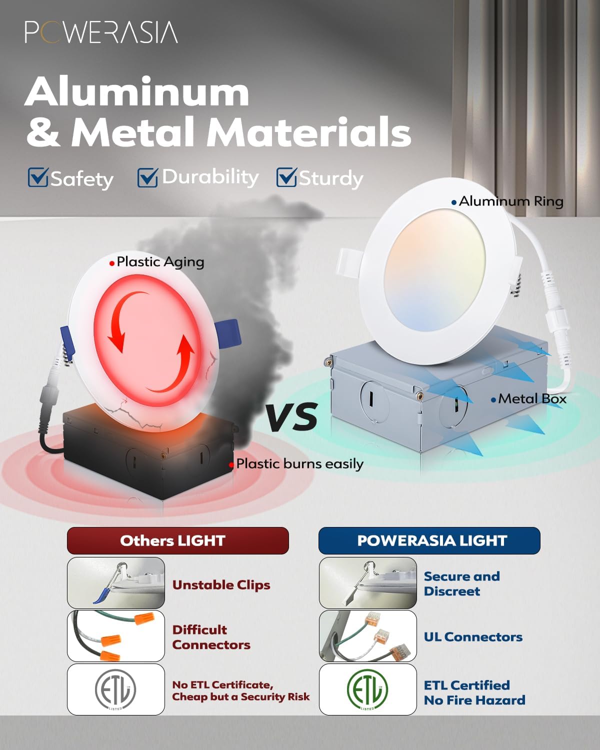 - 💡【High Brightness】 POWERASIA 90+CRI technology brings true color rendering to your house. The 6-inch slim lights use the new generation of LED chips with higher lumens and lower power. 1200LM 15 Watts, which equals to 220W incandescent lamp, saving you up to 88% in energy costs.