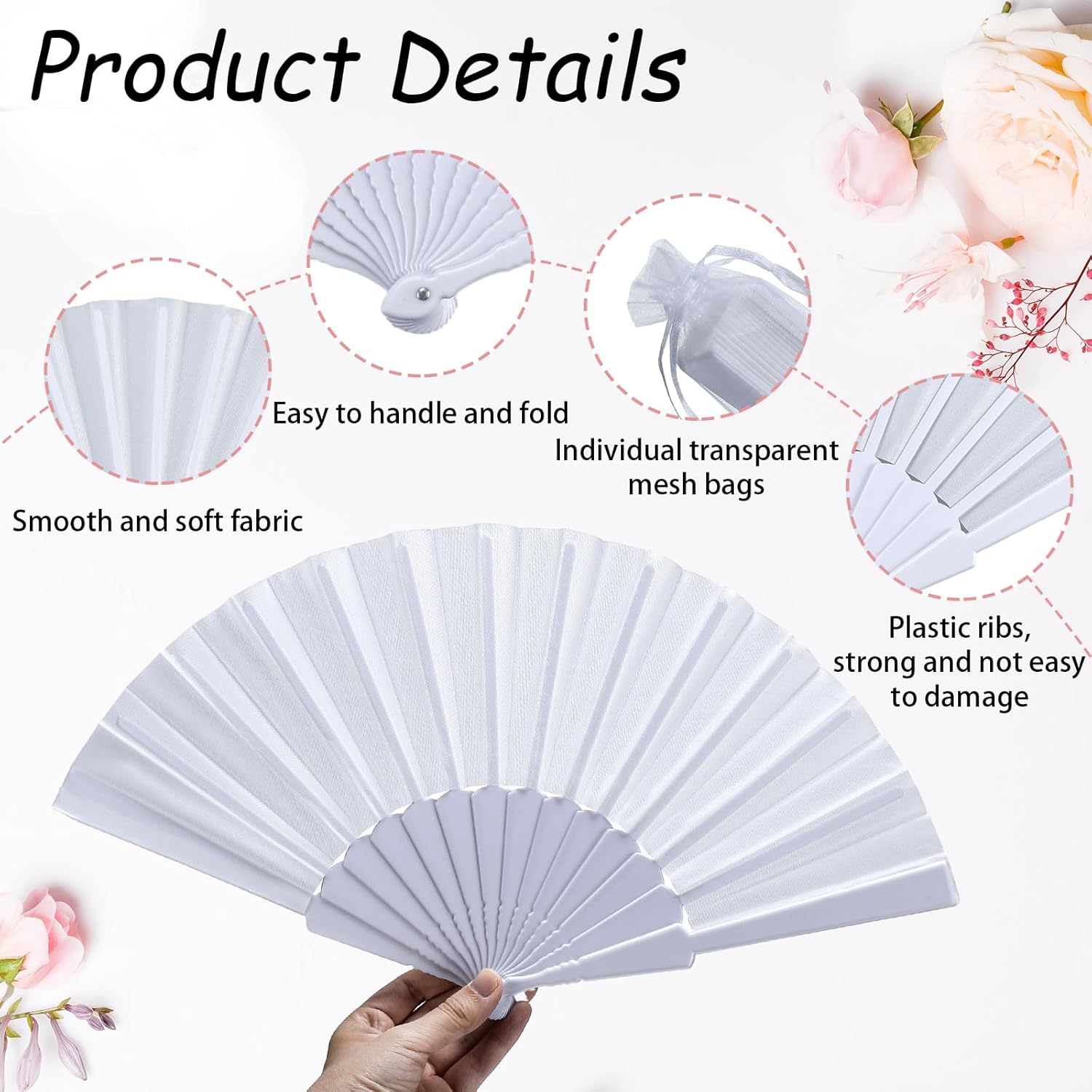 - Made of Quality Material: these handheld folding fans are made of reliable plastic and white fabric material, not easy to damage, easy to open and close, makes the folding fan lighter and more durable