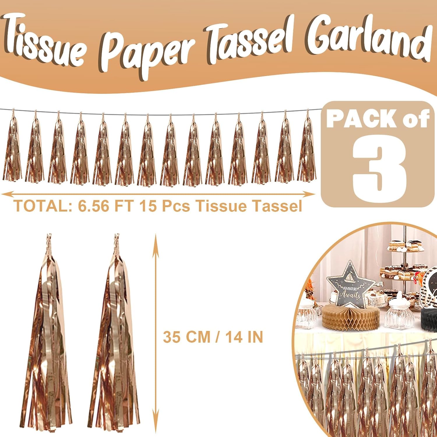 - 【Champagne gold Party Supplies Set】: The total length of the Champagne gold birthday tassels banner is 29.5 feet 45tassels, divided into 3 strips, each 9.8 feet long. Each banner contains 15 tassels, and each tassel measures 14 inches, for birthday decorations many occasions, and so on