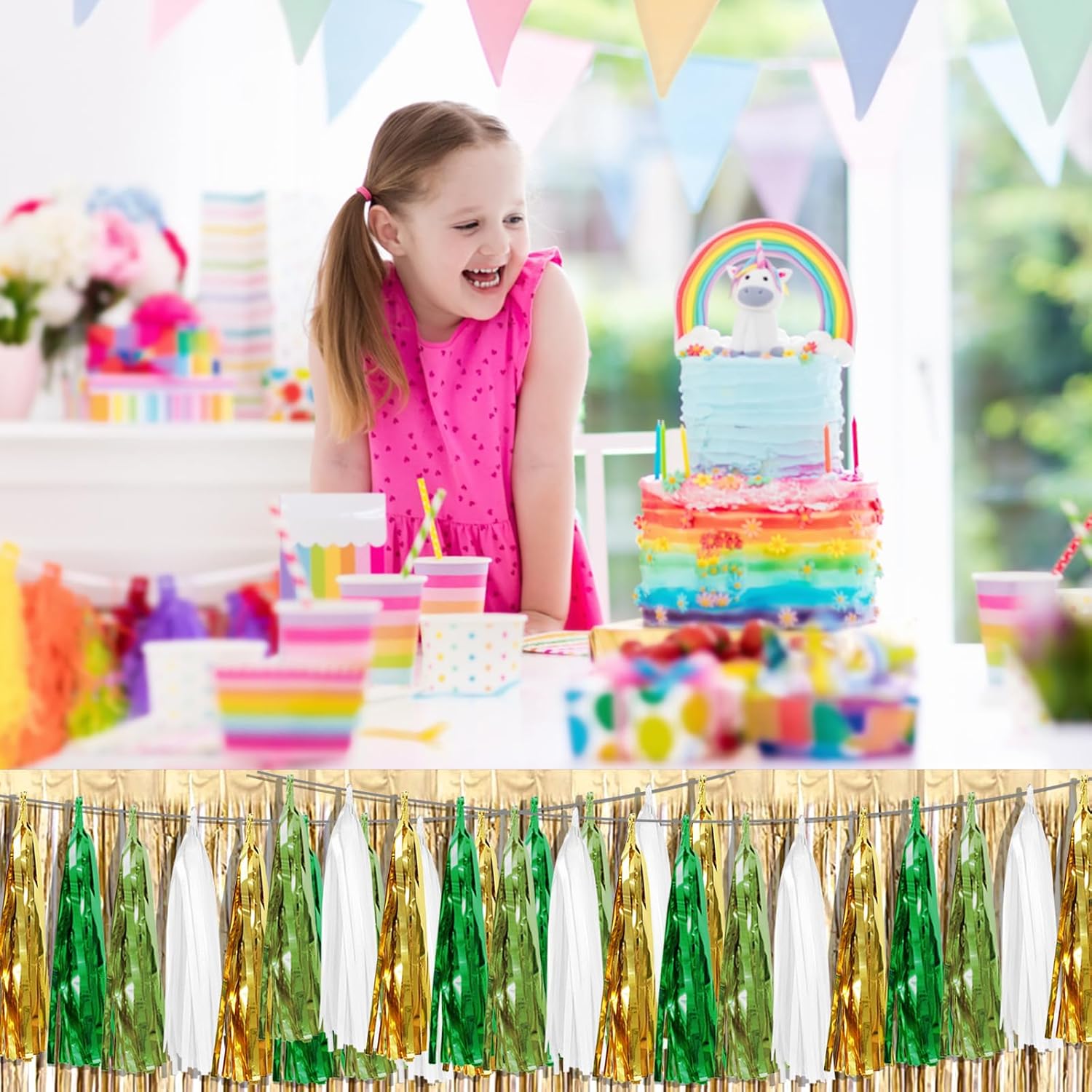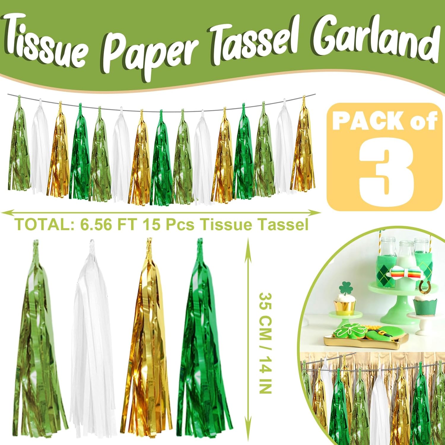 - 【Light Green White Gold Green Party Supplies Set】: The total length of the Light Green White Gold Green birthday tassels banner is 29.5 feet 45tassels, divided into 3 strips, each 9.8 feet long. Each banner contains 15 tassels, and each tassel measures 14 inches, for birthday decorations many occasions, and so on