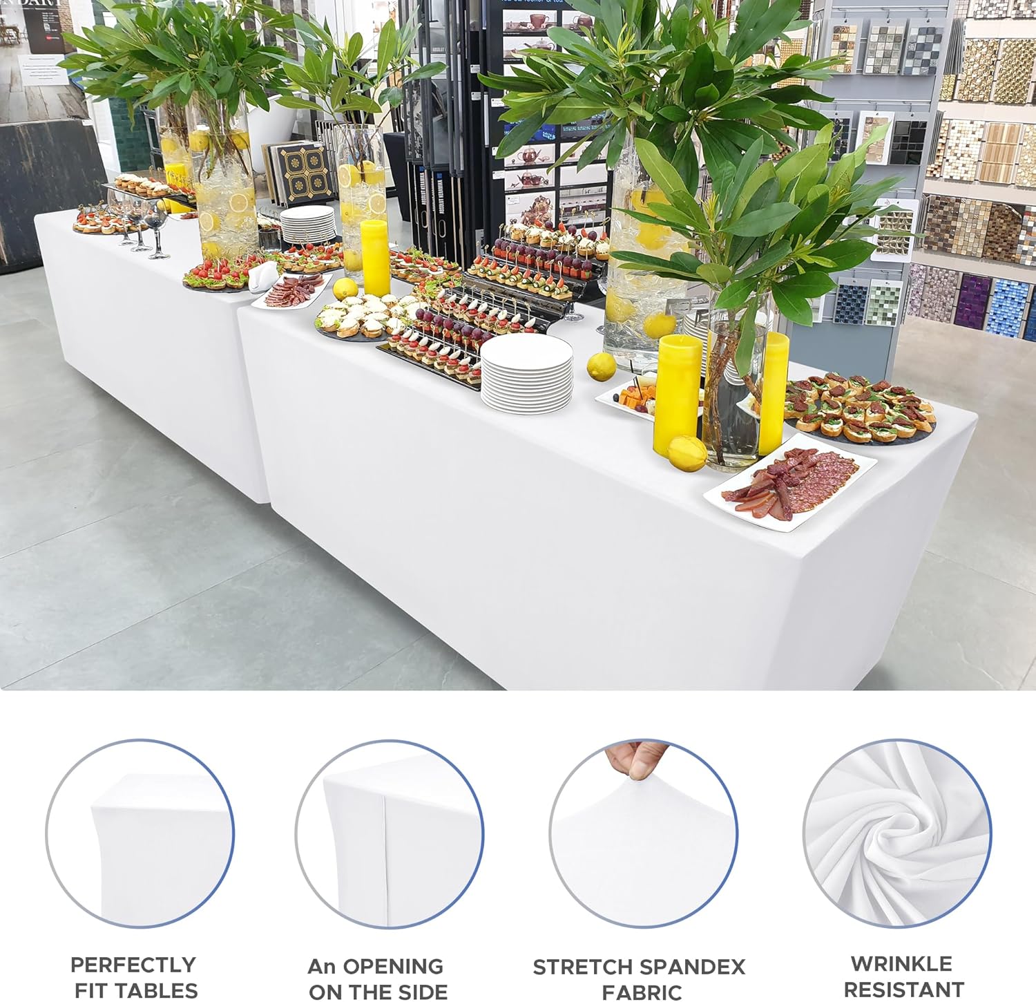 - Featured stretch spandex fabric, these soft rectangle tablecloths are made to resist stains and wrinkles. These decorative and practical table covers can be reused after washing.