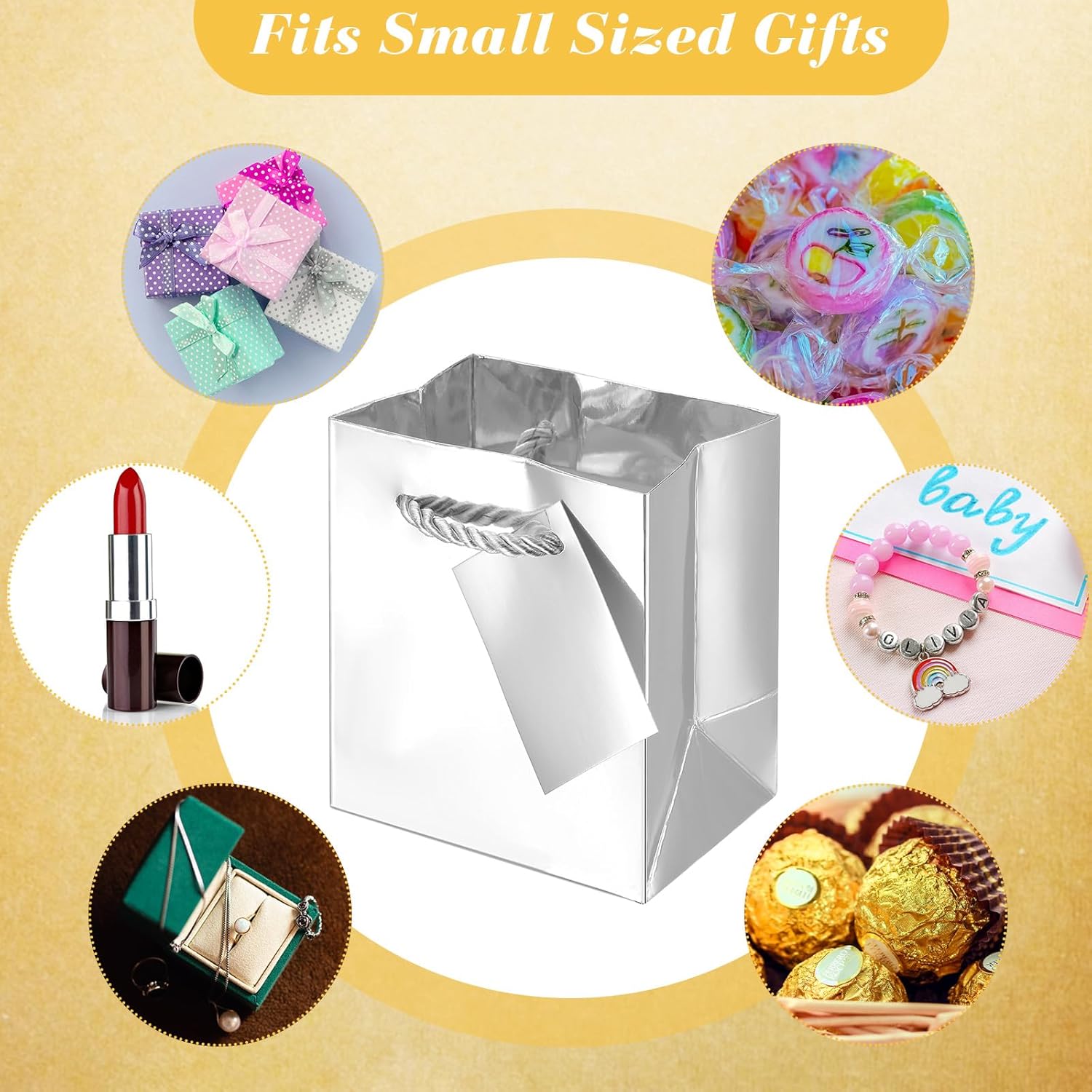 Sherr 100 Pack Mini Gift Bags Bulk, 4 x 2.75 x 4.5 Inches Paper Bags with Tags, Extra Small Paper Gift Boxes with Handles for Birthday, Party Favors, Weddings, Small Business(Silver)