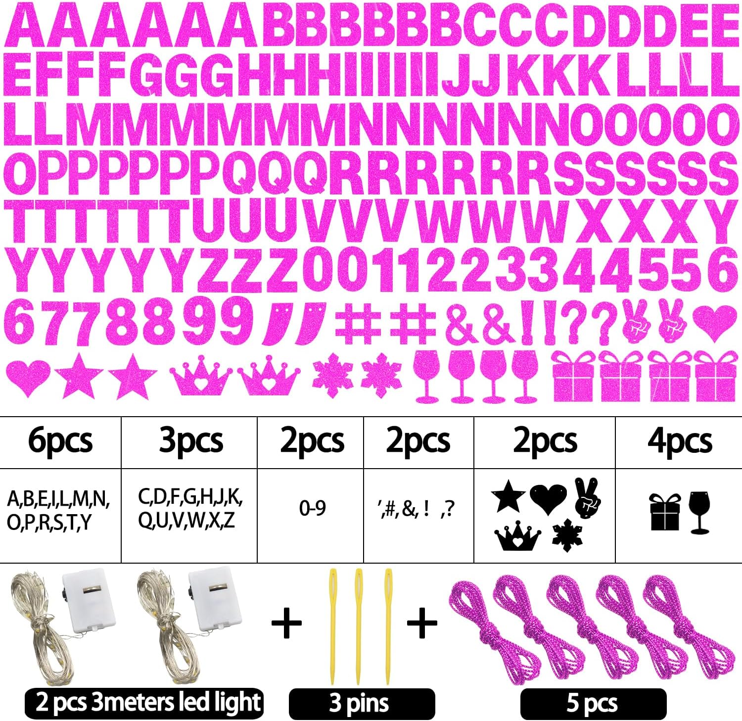 - 【What you can GET】175 pieces of letters and numbers Banner Kit, including 6pcs'A,B,E,I,R,T,L,M,N,O,P,S,Y' letters, 3pcs 'C,D,G,H,U,V,W,F,J,K,Q,X,' letters, 2pcs '0-9' numbers,2pcs' #,',&, !,? ',and 2 ‘stars, crown,snow, hearts,Yeah’ and 4pcs gift box,wine glass,come with 5 ropes ,2 LED light strings and 3pcs Plastic Sewing Needles ; Nice combination meet your various parties decorative demands,exquisite decorations can make your party more attractive!