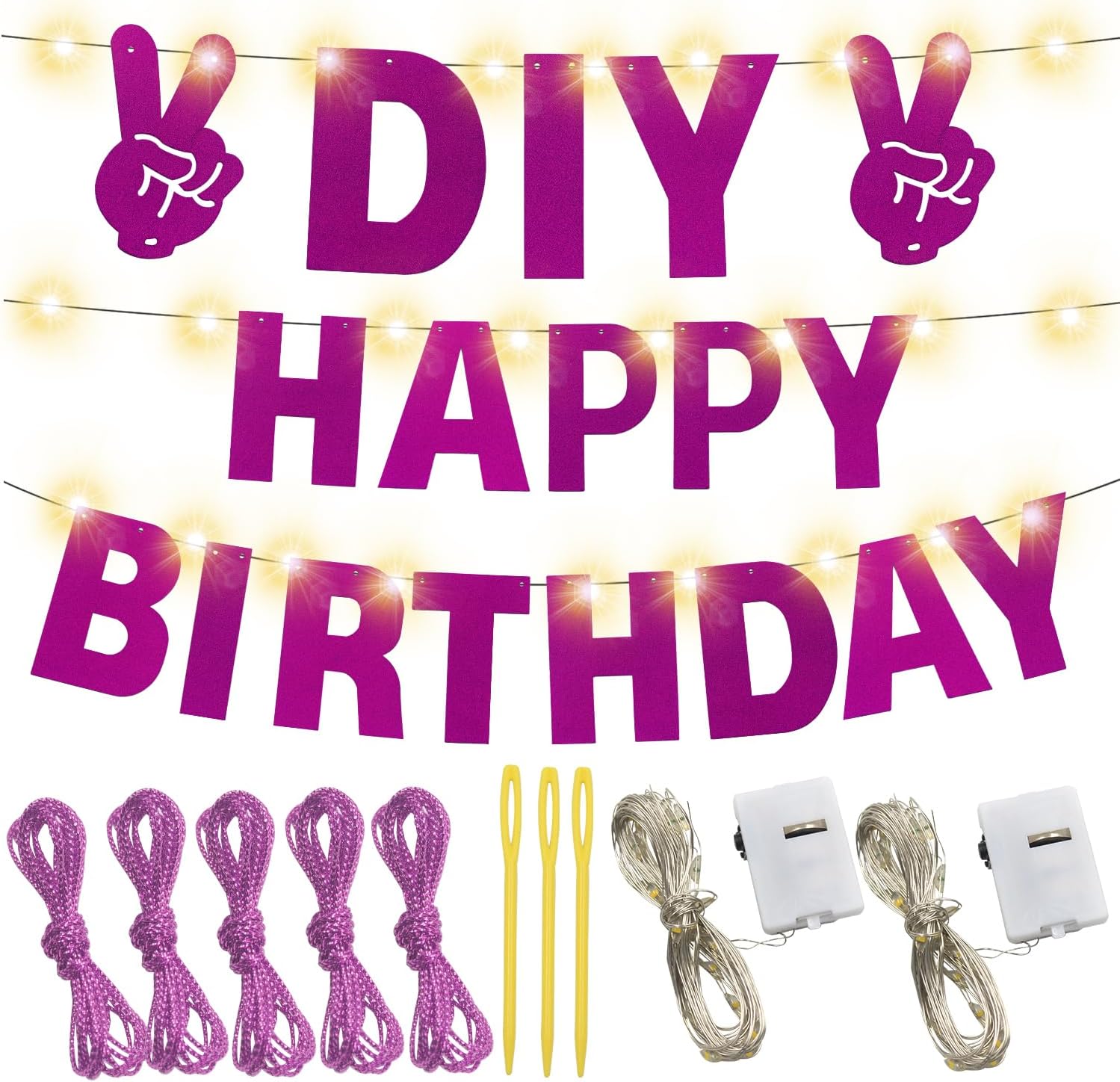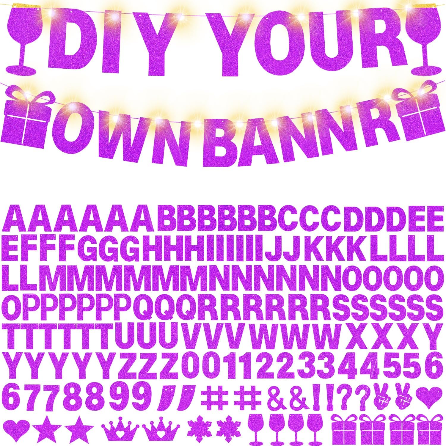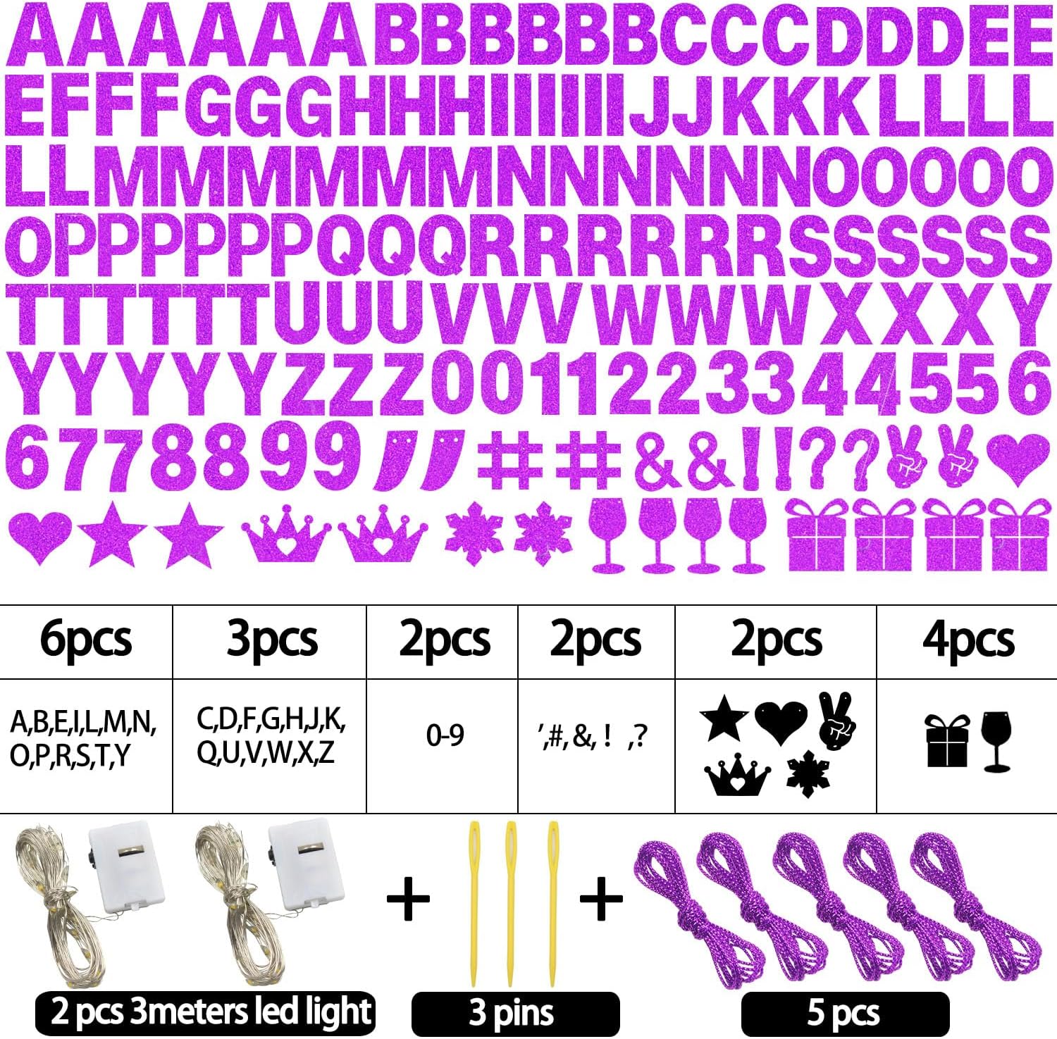 - 【What you can GET】175 pieces of letters and numbers Banner Kit, including 6pcs'A,B,E,I,R,T,L,M,N,O,P,S,Y' letters, 3pcs 'C,D,G,H,U,V,W,F,J,K,Q,X,' letters, 2pcs '0-9' numbers,2pcs' #,',&, !,? ',and 2 ‘stars, crown,snow, hearts,Yeah’, and 4pcs gift box,wine glass,come with 5 ropes ,2 LED light strings and 3pcs Plastic Sewing Needles ; Nice combination meet your various parties decorative demands,exquisite decorations can make your party more attractive!