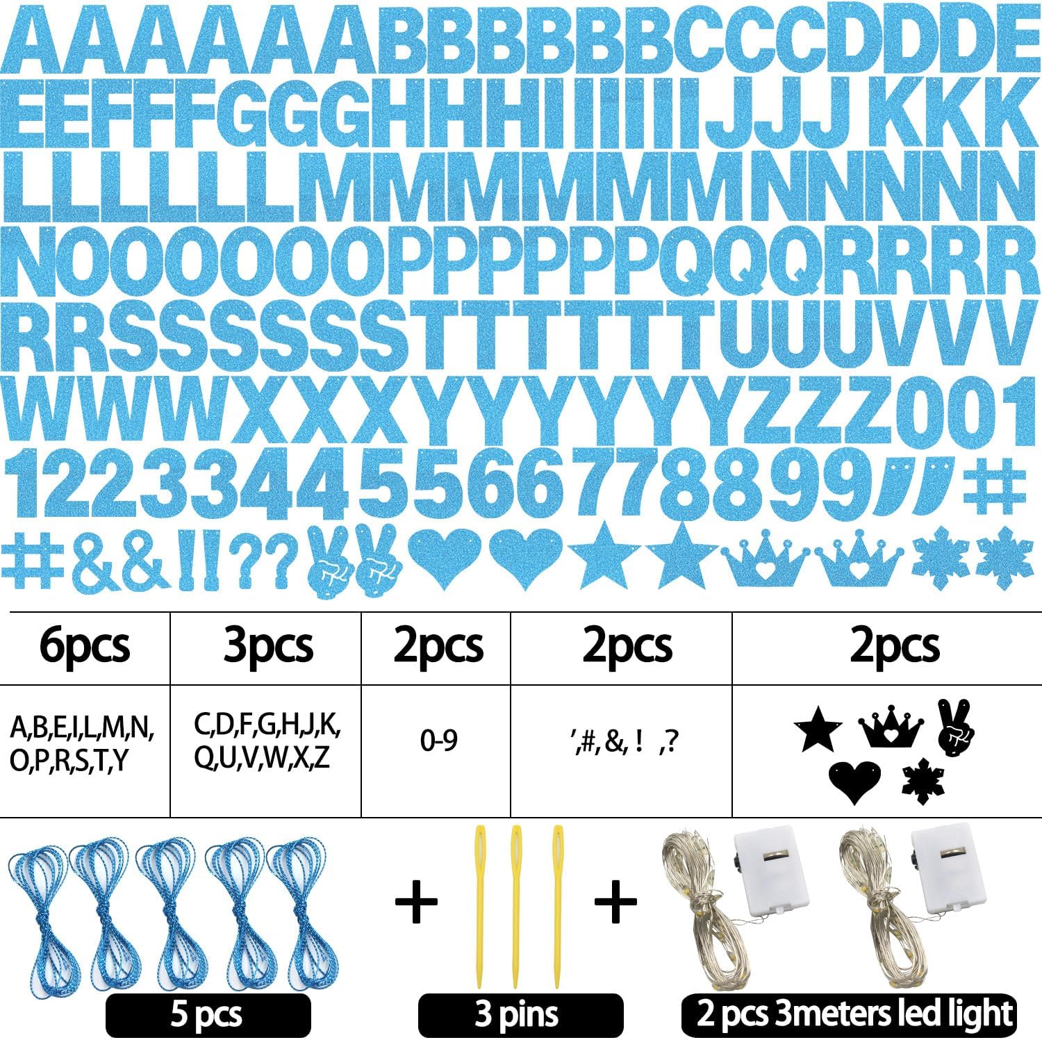 - 【What you can GET】167 pieces of letters and numbers Banner Kit, including 6pcs'A,B,E,I,R,T,L,M,N,O,P,S,Y' letters, 3pcs 'C,D,G,H,U,V,W,F,J,K,Q,X,' letters, 2pcs '0-9' numbers,2pcs' #,',&, !,? ',and 2 ‘stars, crown,snow, hearts,Yeah’ come with 5 ropes ,2 LED light strings and 3pcs Plastic Sewing Needles ; Nice combination meet your various parties decorative demands,exquisite decorations can make your party more attractive!