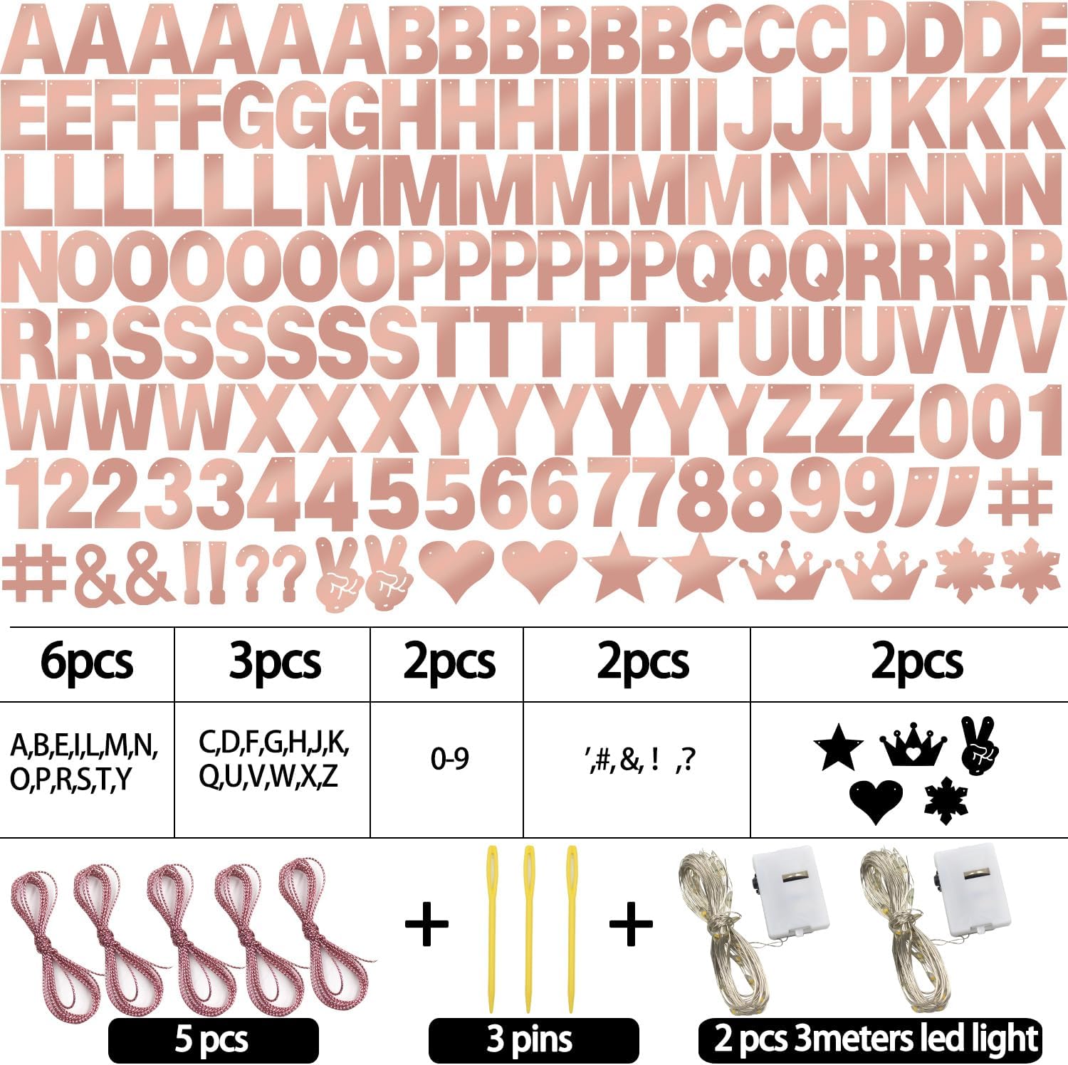 - 【What you can GET】167 pieces of letters and numbers Banner Kit, including 6pcs'A,B,E,I,R,T,L,M,N,O,P,S,Y' letters, 3pcs 'C,D,G,H,U,V,W,F,J,K,Q,X,' letters, 2pcs '0-9' numbers,2pcs' #,',&, !,? ',and 2 ‘stars, crown,snow, hearts,Yeah’ come with 5 ropes ,2 LED light strings and 3pcs Plastic Sewing Needles ; Nice combination meet your various parties decorative demands,exquisite decorations can make your party more attractive!