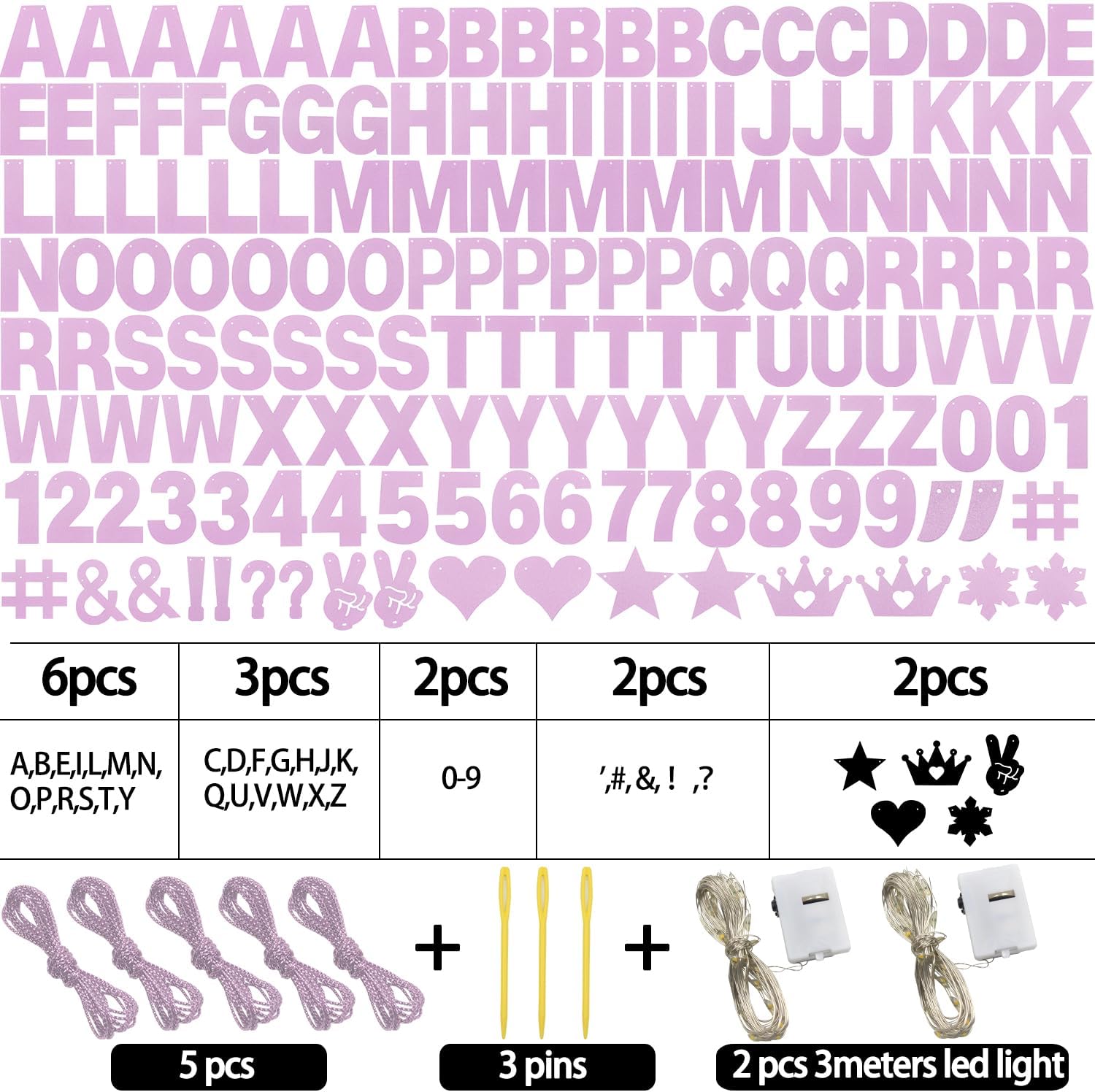 - 【What you can GET】167 pieces of letters and numbers Banner Kit, including 6pcs'A,B,E,I,R,T,L,M,N,O,P,S,Y' letters, 3pcs 'C,D,G,H,U,V,W,F,J,K,Q,X,' letters, 2pcs '0-9' numbers,2pcs' #,',&, !,? ',and 2 ‘stars, crown,snow, hearts,Yeah’ come with 5 ropes ,2 LED light strings and 3pcs Plastic Sewing Needles ; Nice combination meet your various parties decorative demands,exquisite decorations can make your party more attractive!