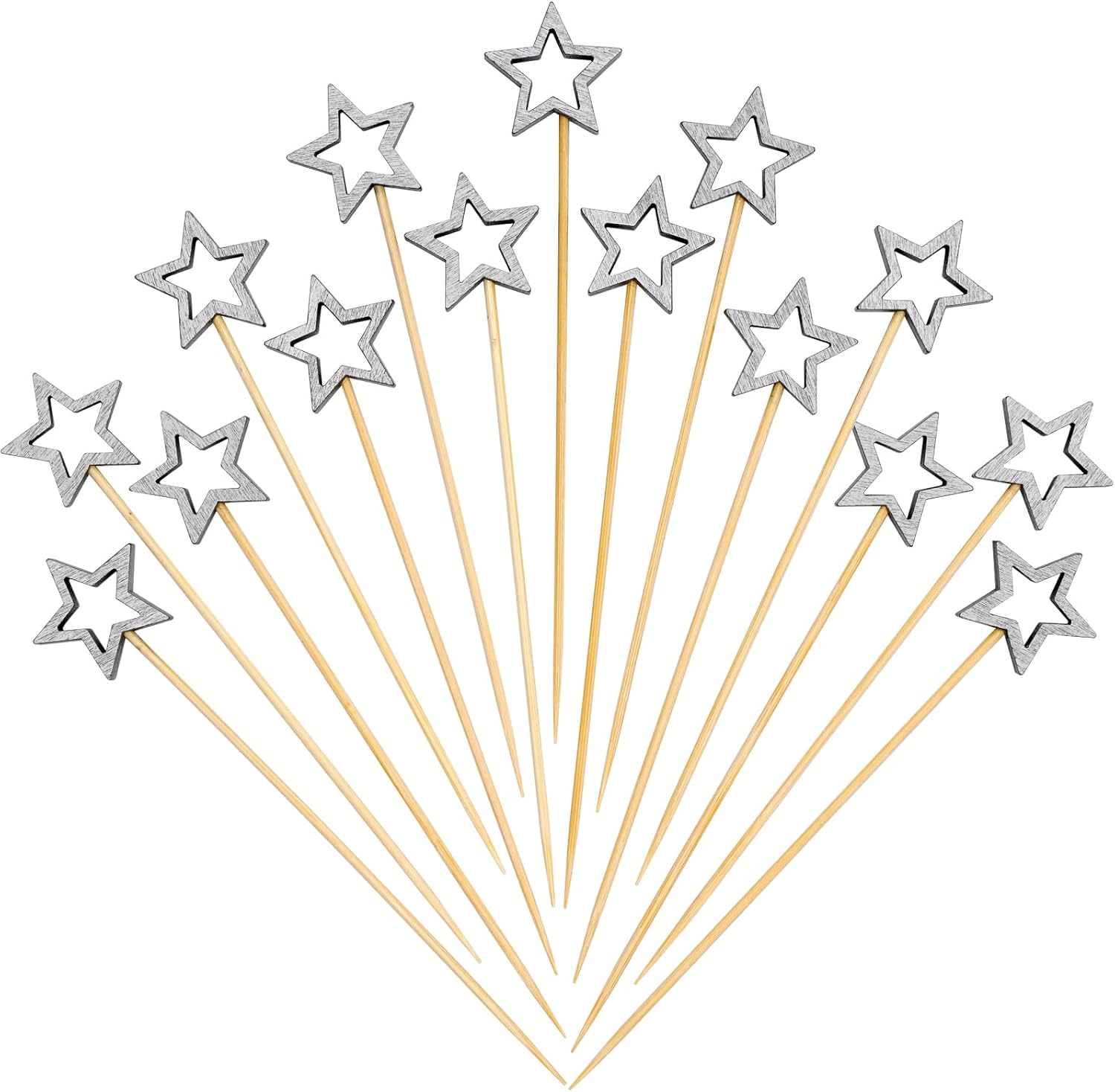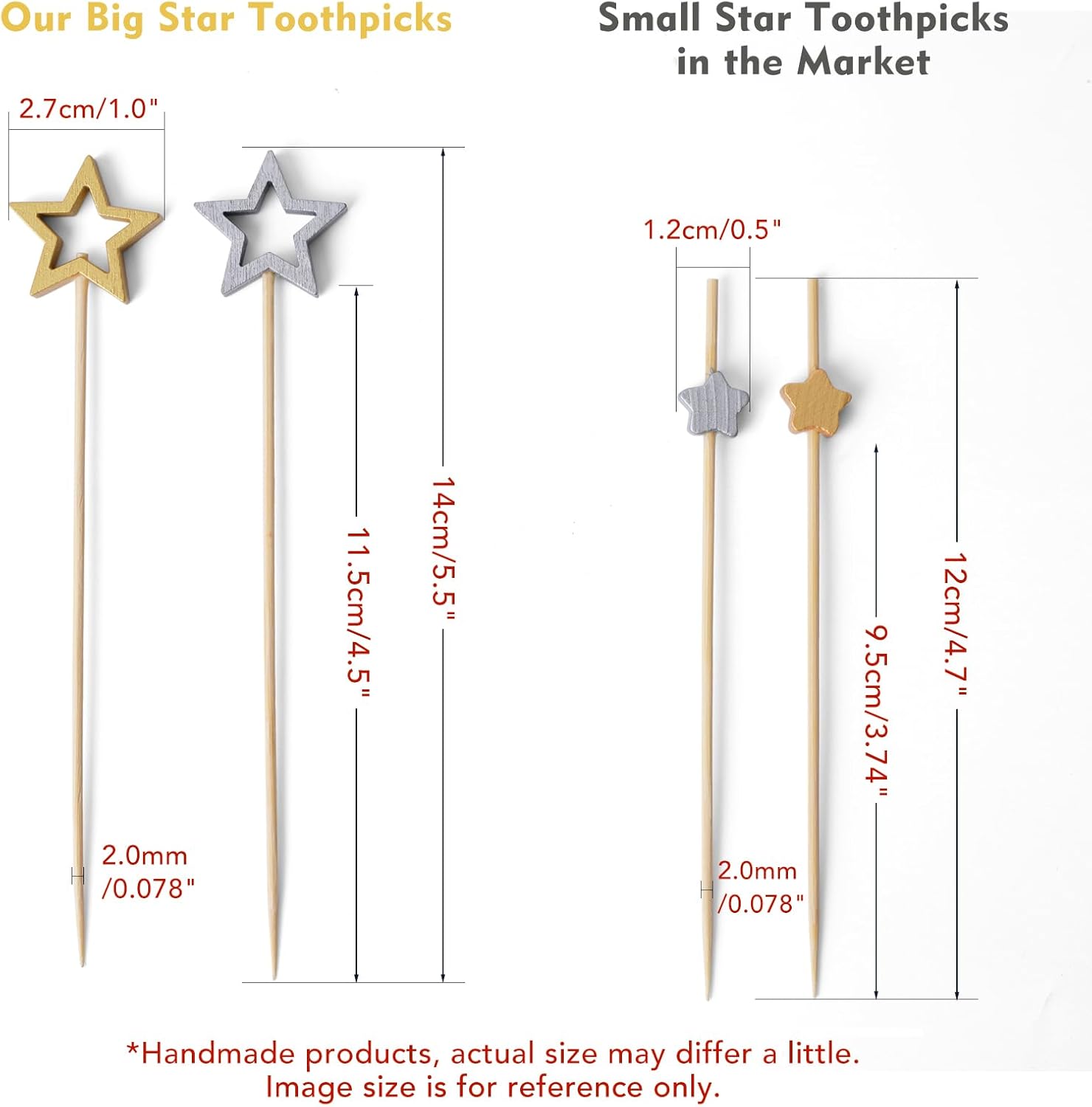 - SPECIFICATIONS: These cocktail toothpicks consist of bamboo sticks and wood hollow silver star decoration heads. The total stick is 5.5 inches long and 4.5 inches usable; Diameter 0.078 inch thick body; Big star size Dia. 1.0 inch. 50 counts per bag