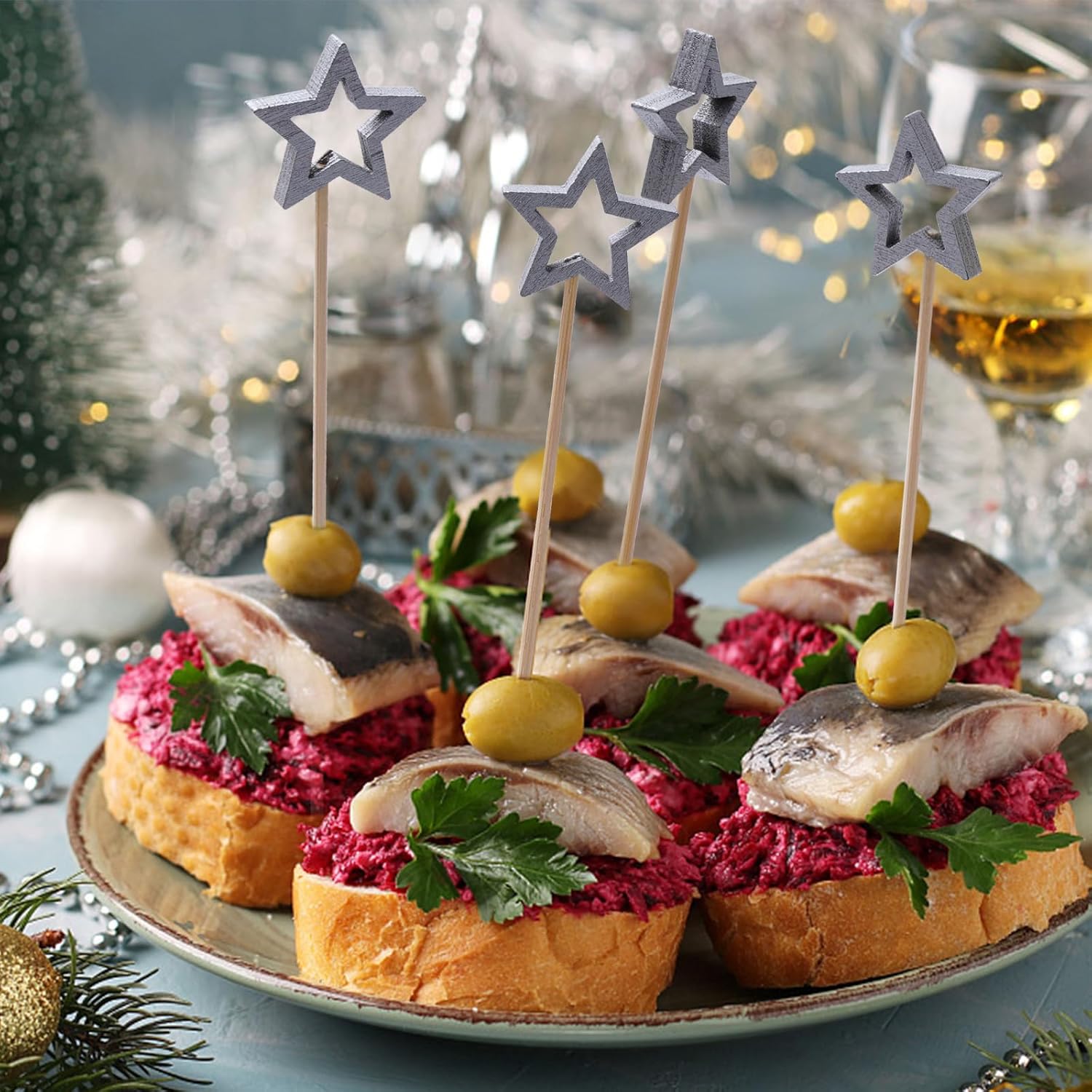Minisland Matt Silver Star Cocktail Picks, 5.5 Inch Long Bamboo Fancy Toothpicks for Appetizers, Decorative Christmas New Year Holiday Party Food Drinks Garnish Fruit Skewer Sticks 50 Counts - MSL431
