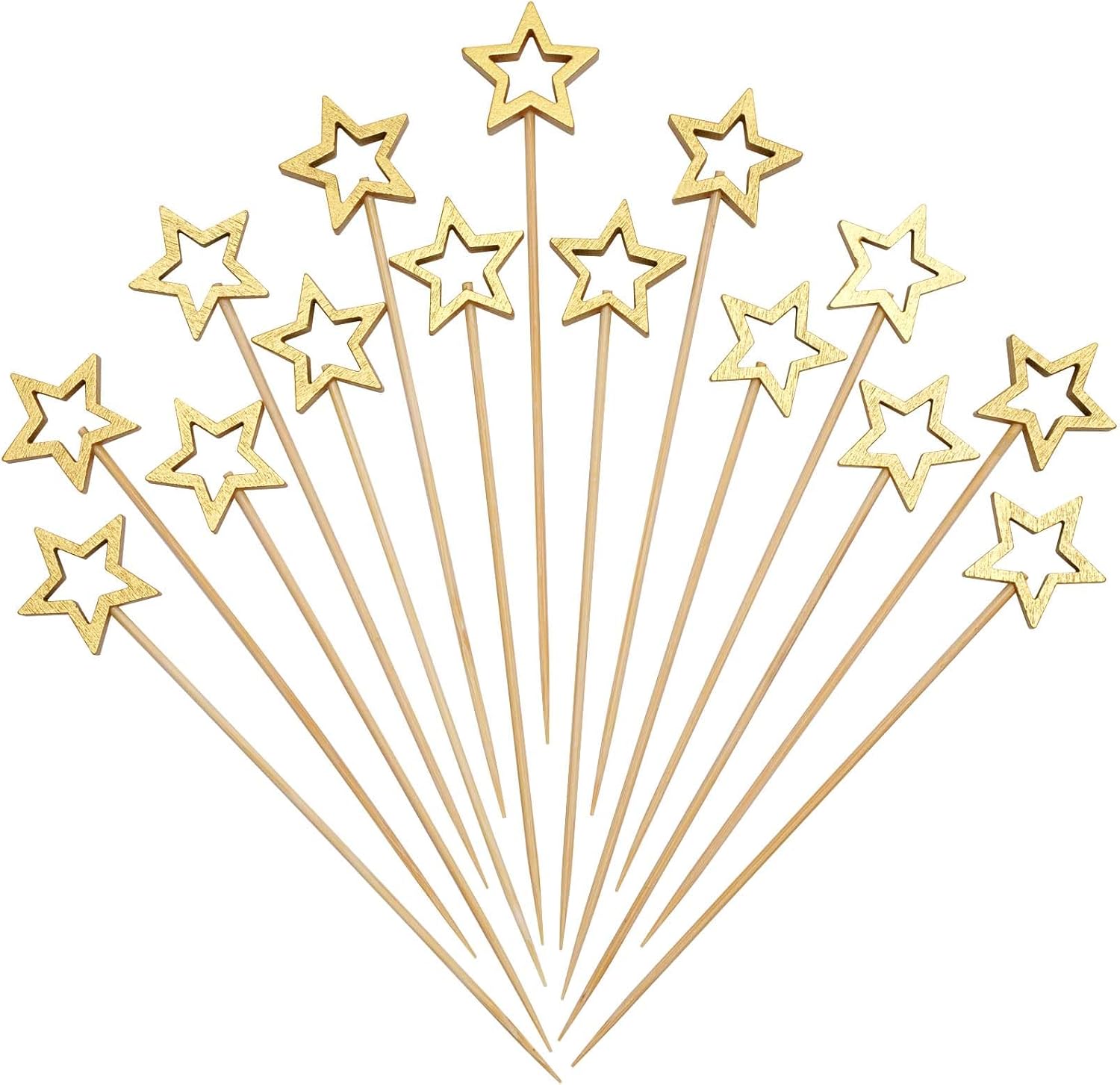 - SPECIFICATIONS: These cocktail toothpicks consist of bamboo sticks and wood hollow golden star decoration heads. The total stick is 5.5 inches long and 4.5 inches usable; Diameter 0.078 inch thick body; Large star size Dia. 1.0 inch. 50 counts per bag