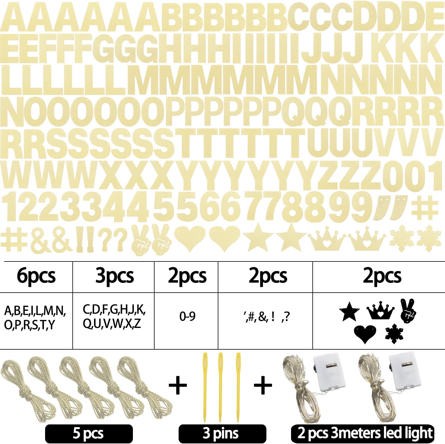 - 【What you can GET】167 pieces of letters and numbers Banner Kit, including 6pcs'A,B,E,I,R,T,L,M,N,O,P,S,Y' letters, 3pcs 'C,D,G,H,U,V,W,F,J,K,Q,X,' letters, 2pcs '0-9' numbers,2pcs' #,',&, !,? ',and 2 ‘stars, crown,snow, hearts,Yeah’ come with 5 ropes ,2 LED light strings and 3pcs Plastic Sewing Needles ; Nice combination meet your various parties decorative demands,exquisite decorations can make your party more attractive!