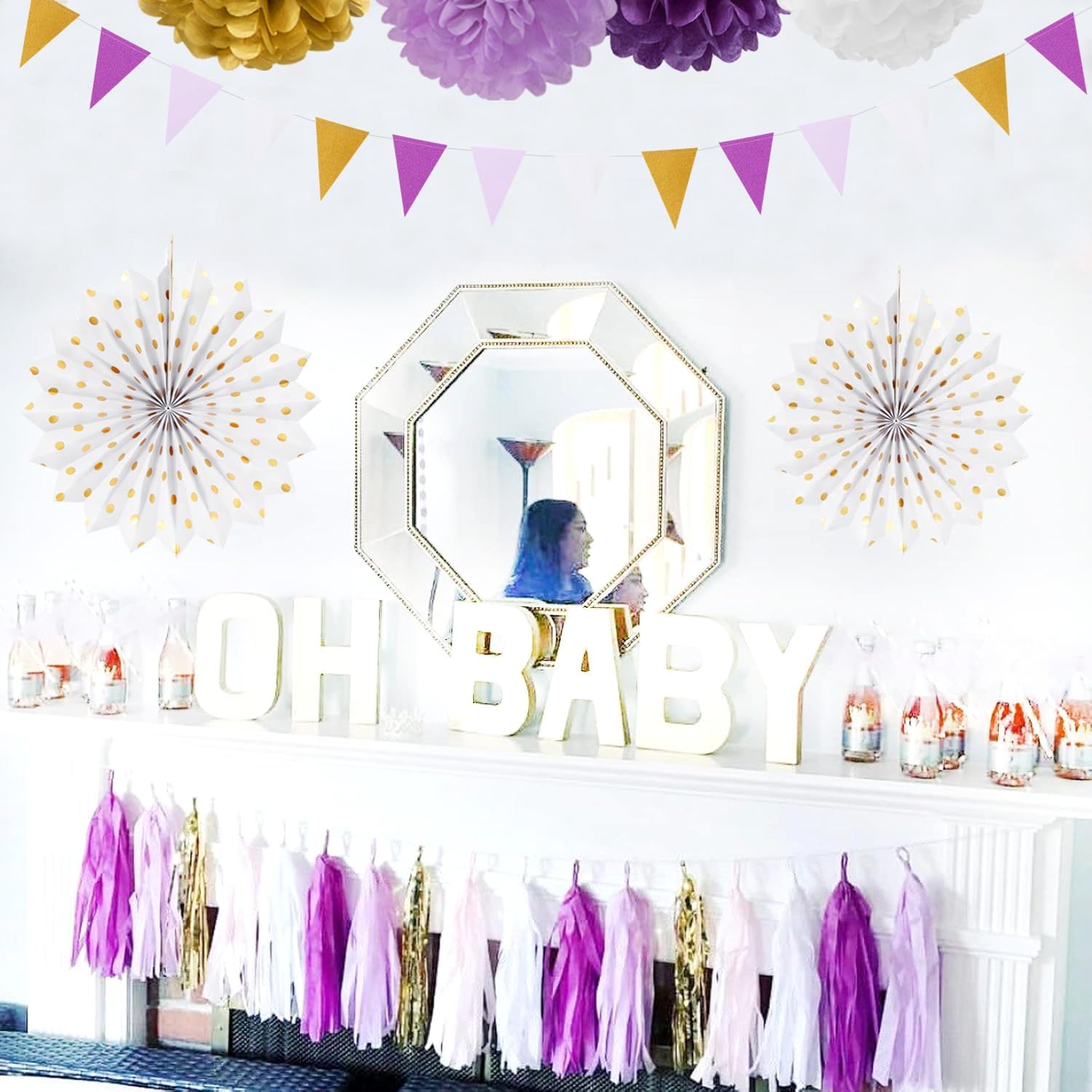 - [Package Includes] Purple lavender white gold party decorations kit contains: 1 x triangle bunting, 4 x paper fans, 9 x tissue pom poms, 2 x honeycomb balls, 4 x paper lanterns, a total of 20 pieces of various sizes of decorations. Better embellish your party.