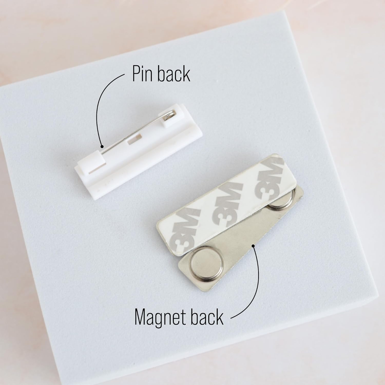 - ABOUT THE TAGS: You can choose between metal looking acrylic material and stainless steel. Both are durable and lightweight for comfortable wear. They are easy to clean and maintain. Their size is 3" x 1" which is a convenient standard size and they are available in silver and gold. They come with either a pin or magnetic backing, allowing you to choose the attachment that best suits your needs or preferences.