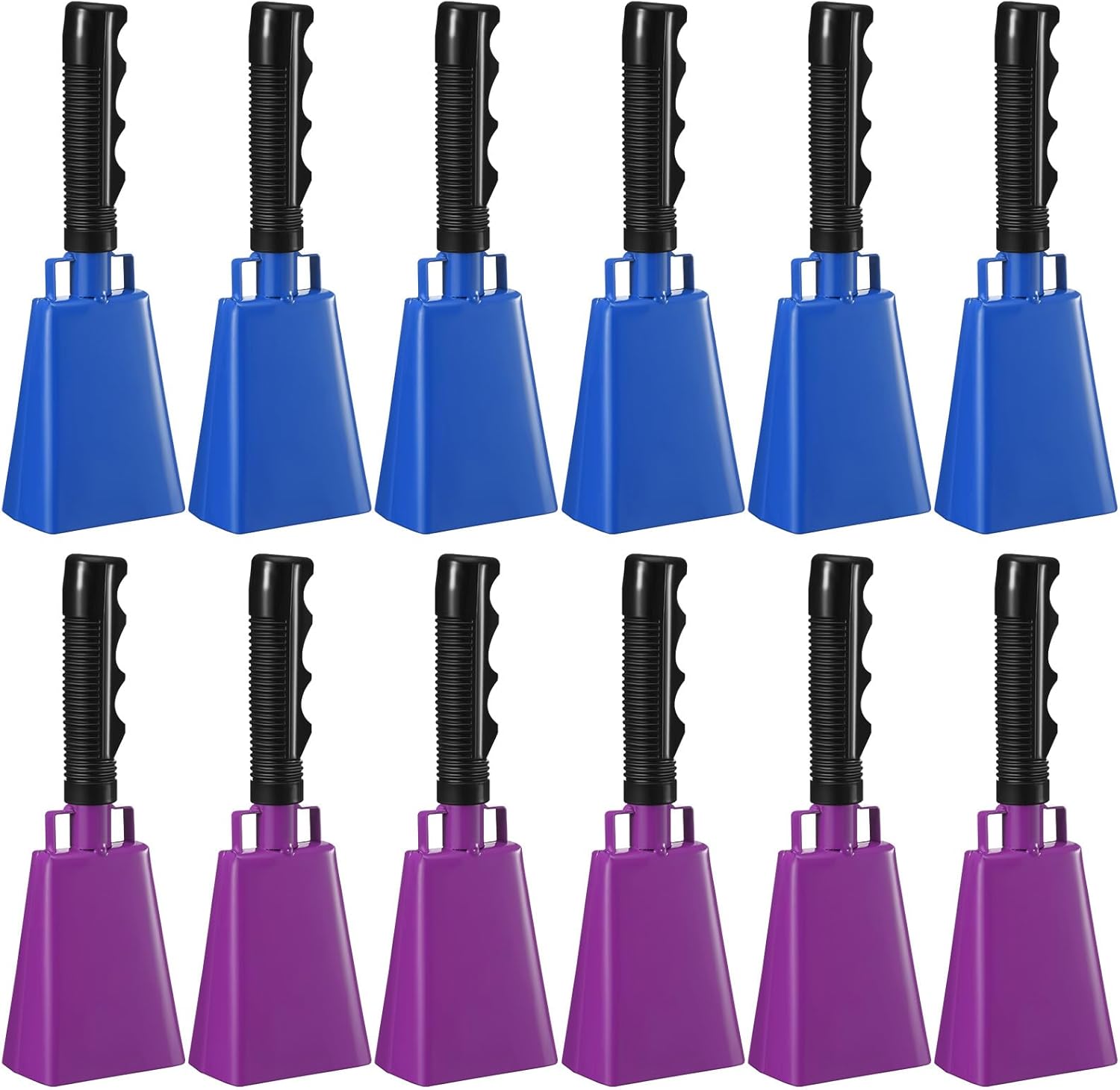 Pelopy 12 Pcs Large Cow Bell 9 '' Cowbell with Handle Cowbells for Sporting Events Hand Percussion Cheering Bell Chimes for Football Game, Alarm Loud Noise Makers, Musical Instrument(Purple, Blue)