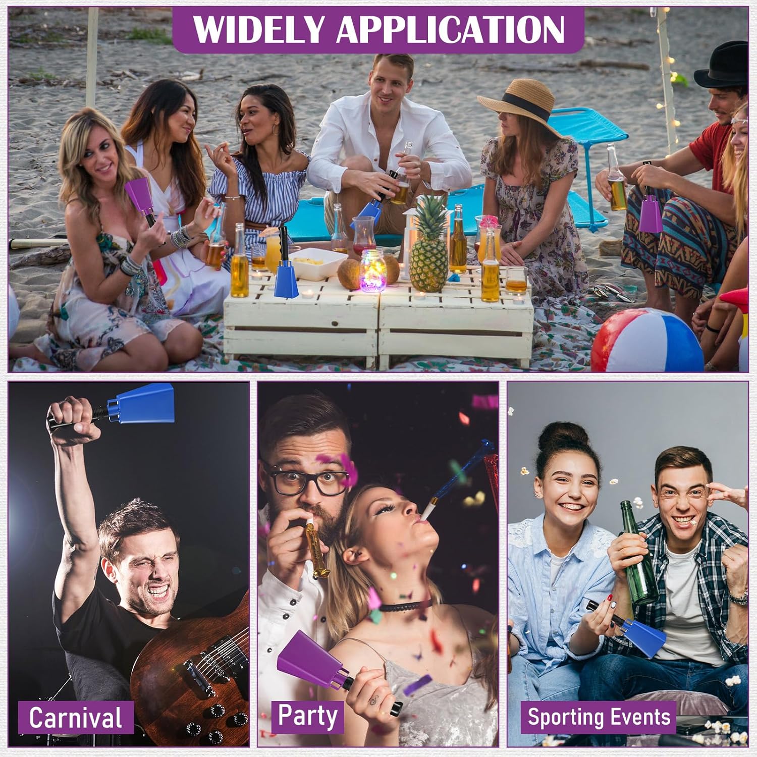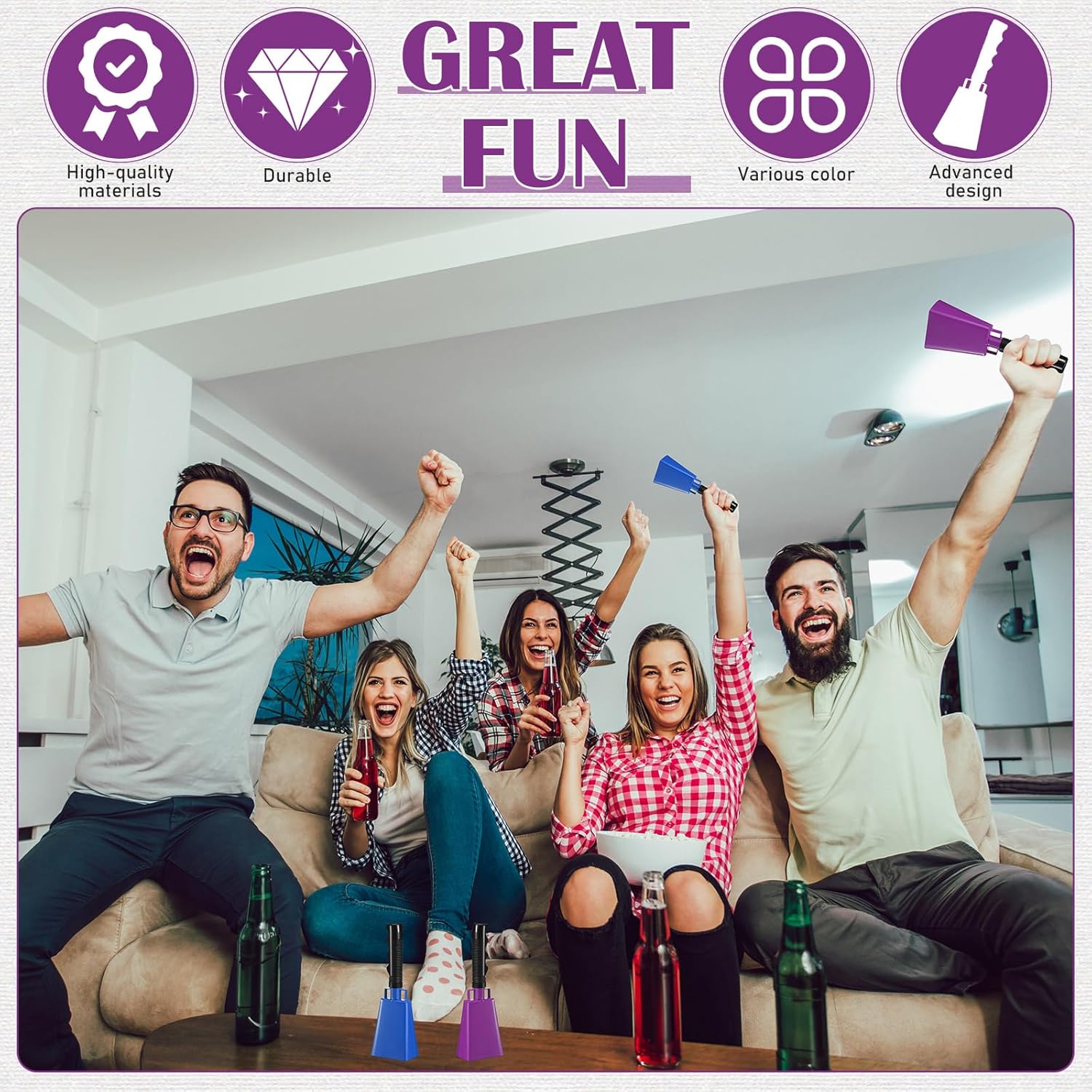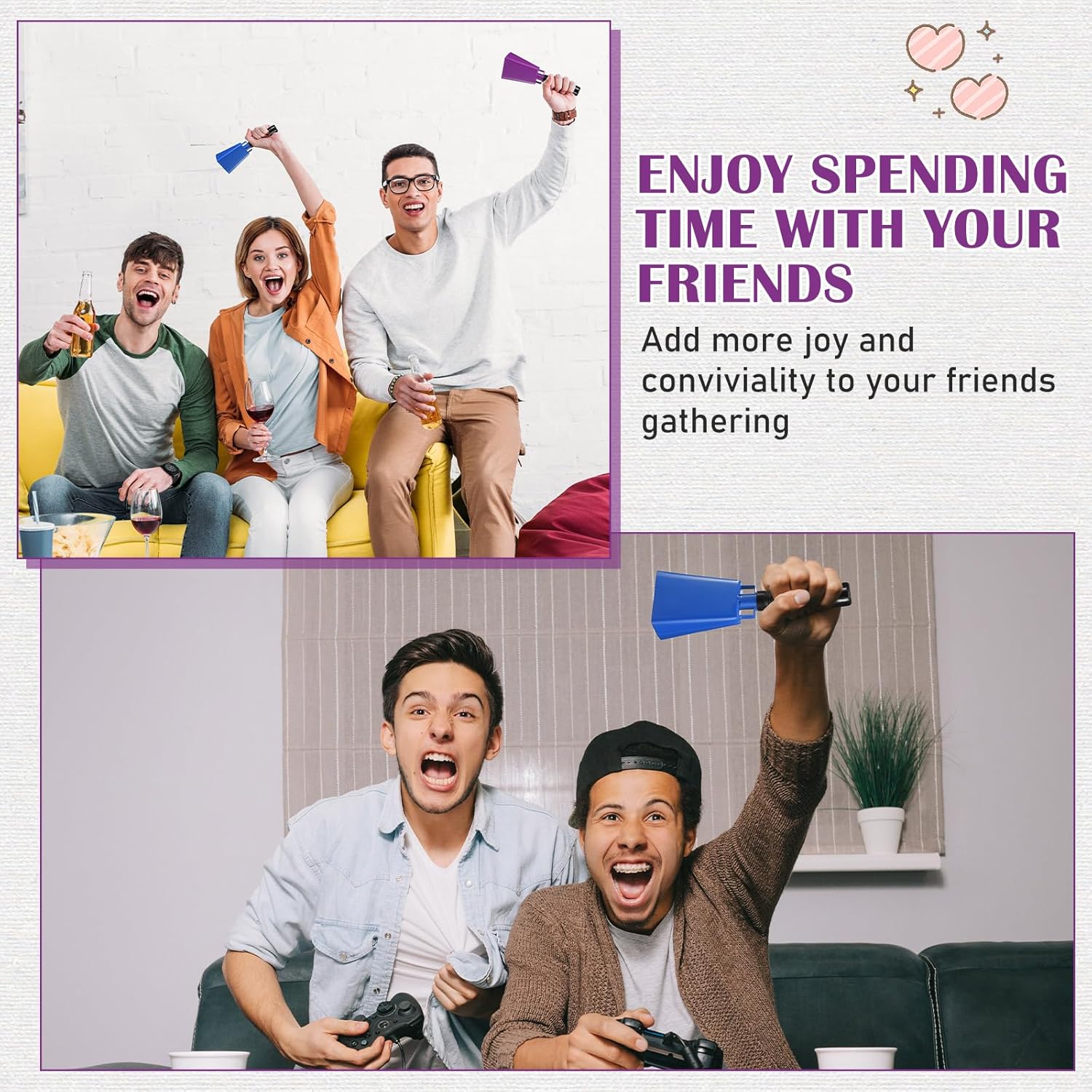 - Alert Safety Tool: the loud and clear sound that the blue and purple noise makers for sporting events produce are good for getting attention, making it useful in performances and sporting events; And also the cow bell is suitable for the elder and disabled to ask for help