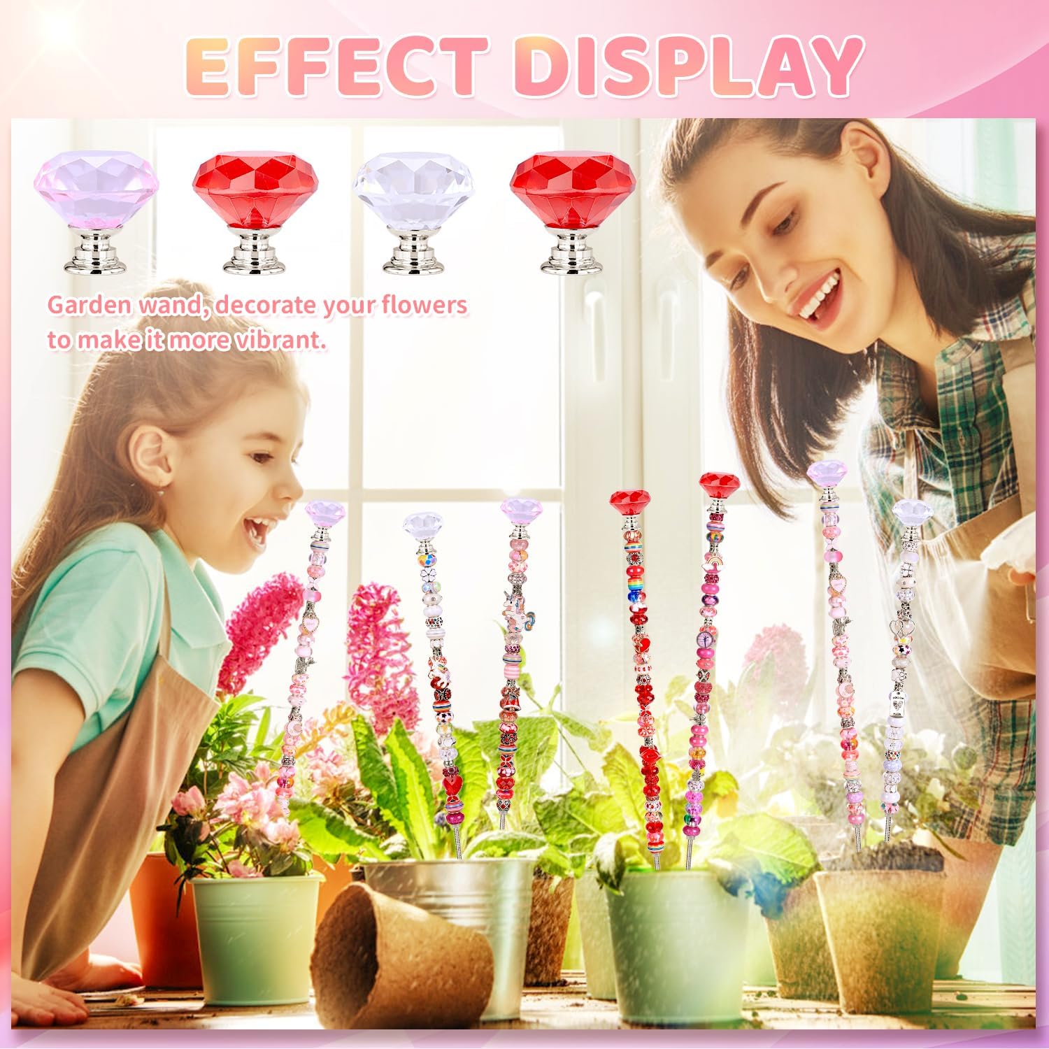 DIY Fairy Wand Garden Beads Stakes Wands Kit,Multiple Color Scheme European Beads Crystal Diamond Tops and 12 or 10 Inch Threaded Rods,Stainless Steel Stakes with Diamond Toppe(Pink+Rose+Red+White)