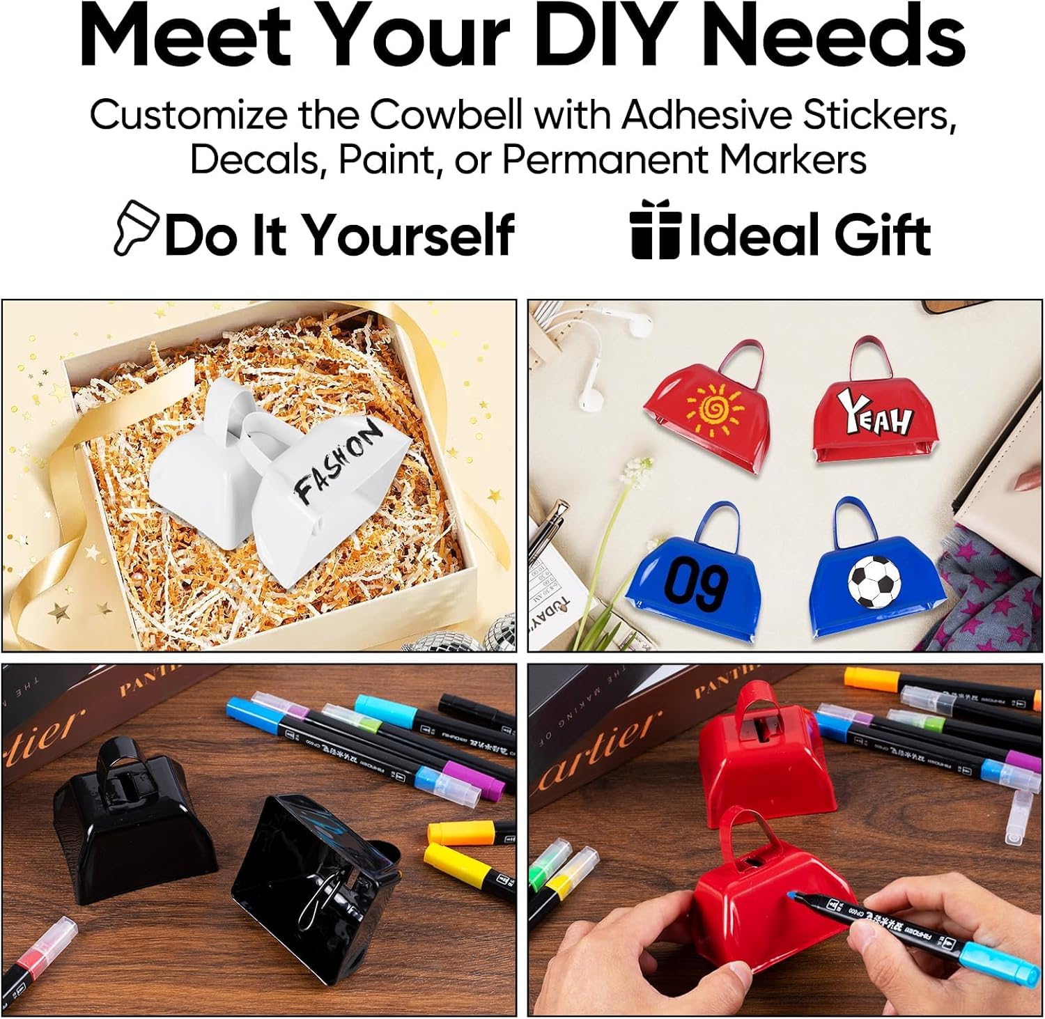- Cowbells with Handle: Coming with 12 pieces cow bells bulk with top handles, easy to carry. The small cowbell offer a blank drawing with a plain surface that allows for easy personalization using markers, stickers, labels, paint or engraving. When not use, beautiful cowbell noisemakers can be hung on the wall or as craft to save space and decorate the room, also can add atmosphere and visual effects in Christmas, Halloween, weddings, and other special festivals.