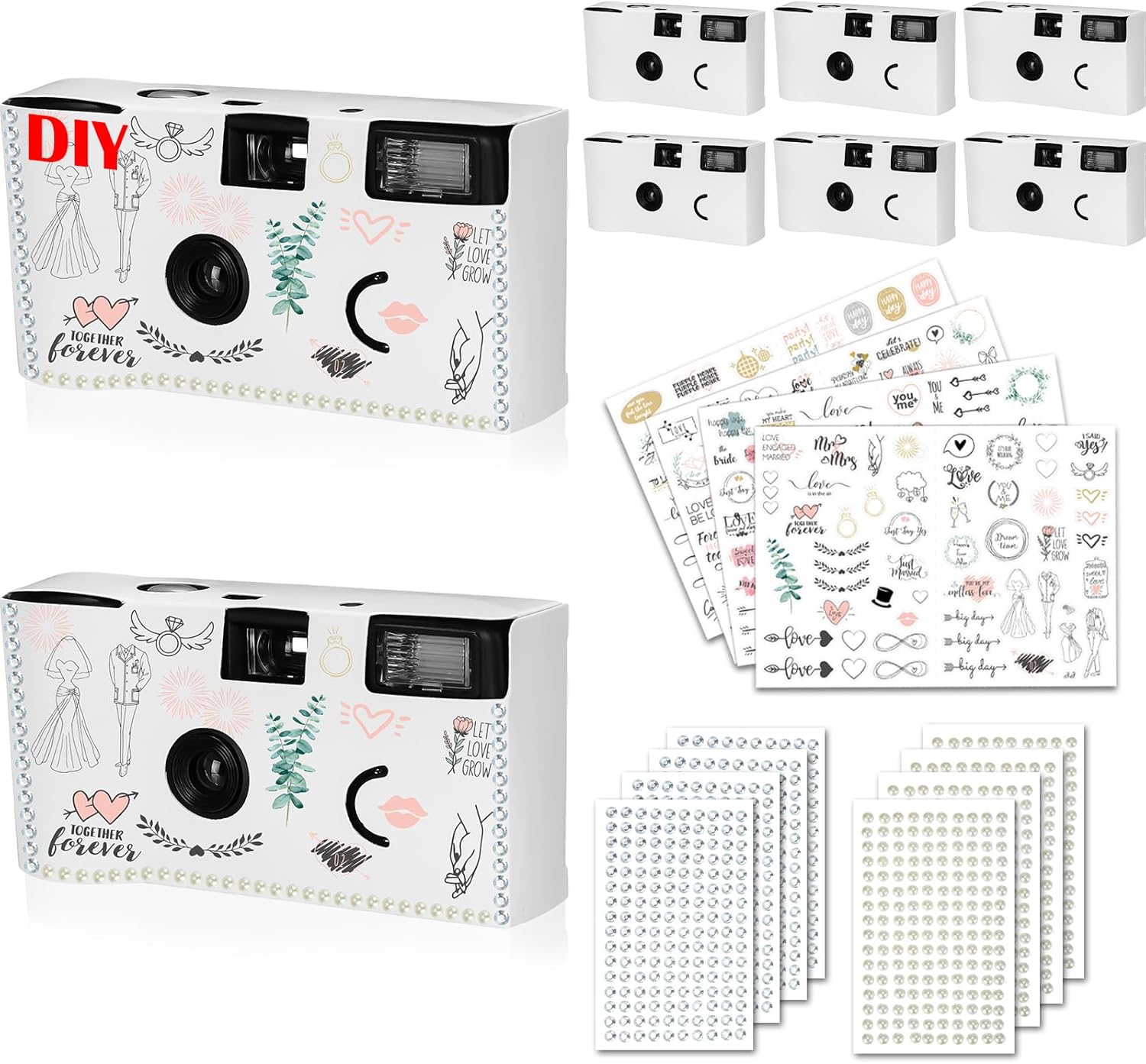 - Sufficient Pack: you will get 8 pieces of disposable cameras with flash; Each disposable camera contains 35 mm color film and AA batteries, ready for use; 4 wedding theme stickers, providing possibilities for your DIY design; 4 different sizes' rhinestone stickers, 4 pearl stickers of different sizes, can decorate your face; Sufficient quantity and rich combinations to meet your various photography and DIY needs