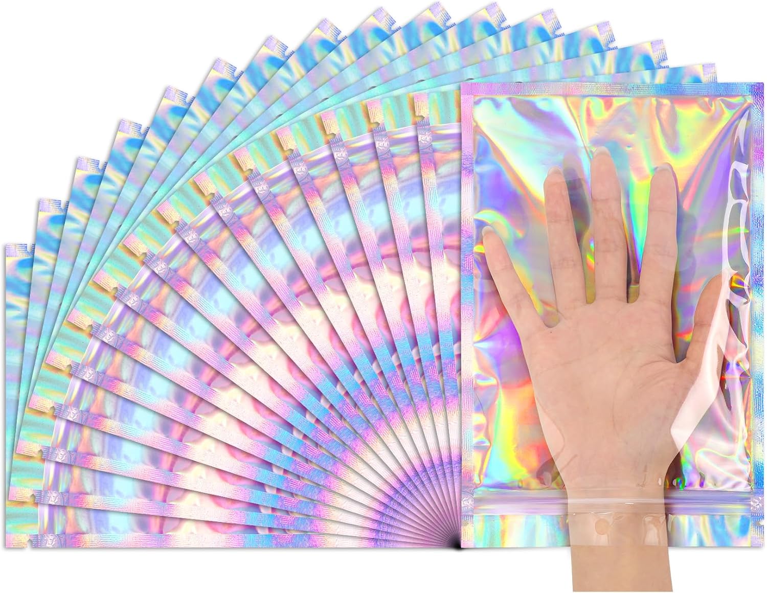 Funfery 50 Pcs Smell Proof Holographic Resealable Bags,6.3x9.4in Clear Window,Mylar Foil Baggie with Zipper,Sealing Pouch Packaging Bag for Food Storage,Candy,Party Favor Sample Business Supplies