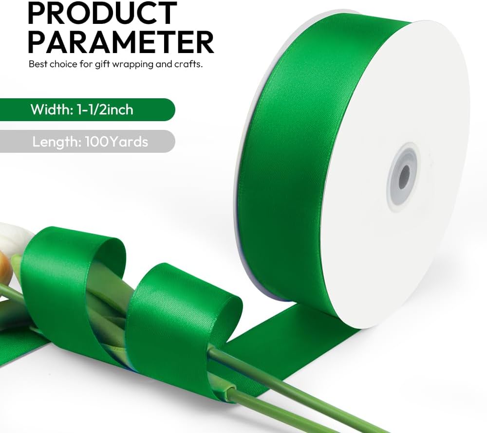 1-1/2 Inch 100 Yards Satin Ribbon Green, Solid Color Fabric Ribbon for Gift Wrapping, Wedding, Polyester Gift Ribbon for Birthday Party Decoration, Craft, Hair, Floral, Sewing