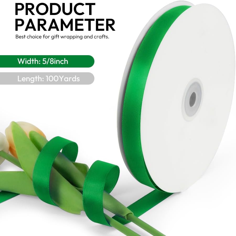 5/8 Inch 100 Yards Satin Ribbon Green, Solid Color Fabric Ribbon for Gift Wrapping, Wedding, Polyester Gift Ribbon for Birthday Party Decoration, Craft, Hair, Floral, Sewing