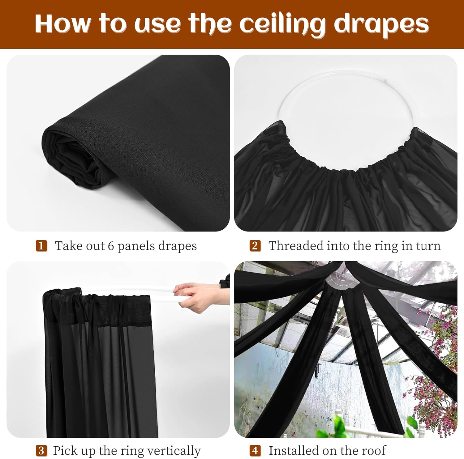 - 📸Chiffon Ceiling Drapes: The package include 6 panels black wedding ceiling drapes (without hanging pieces). Each wedding extra long curtain measure for 5 feet width x 20 feet length. The sufficient quantity can meet your demands for decorating your weddings, parties, receptions. It will help to create a delicate and aesthetic sense to your wedding ceiling decoration.
