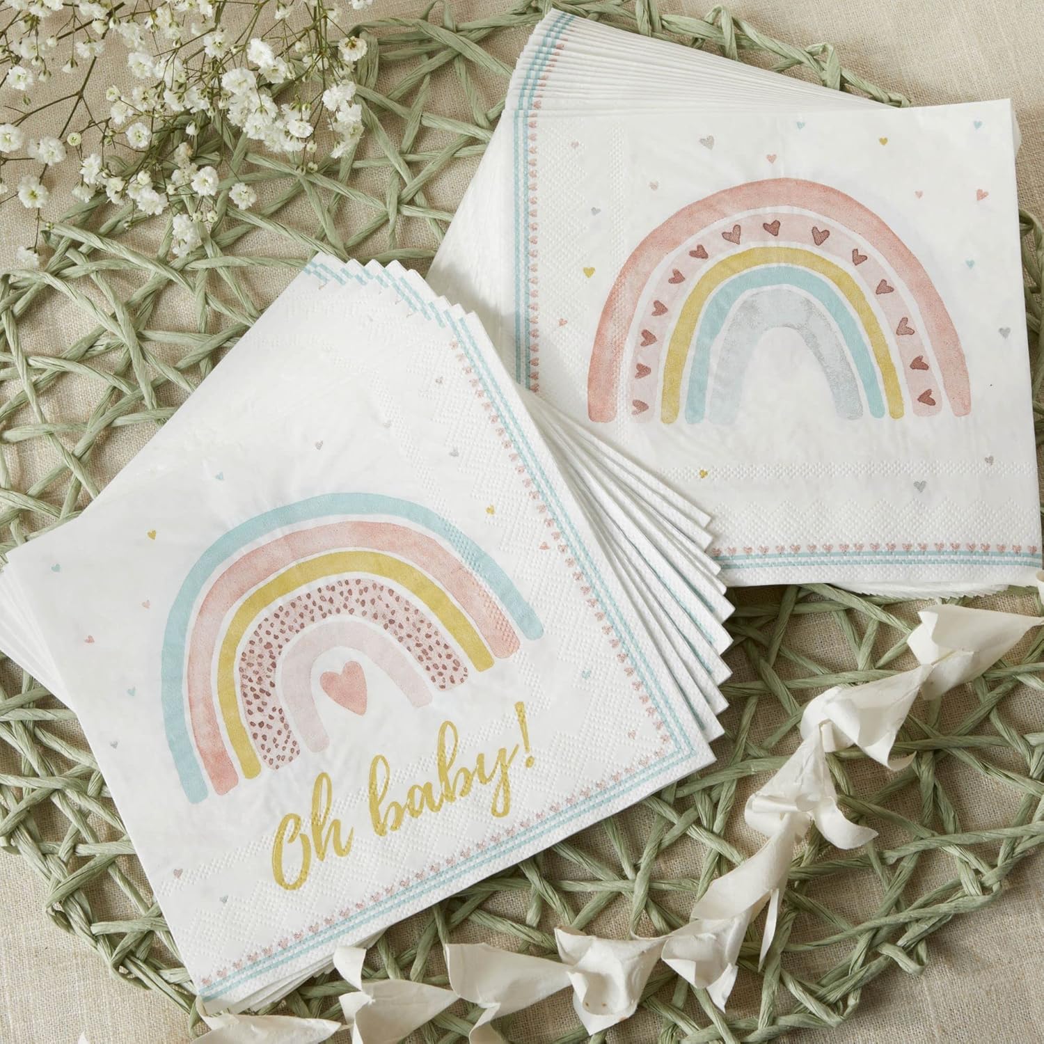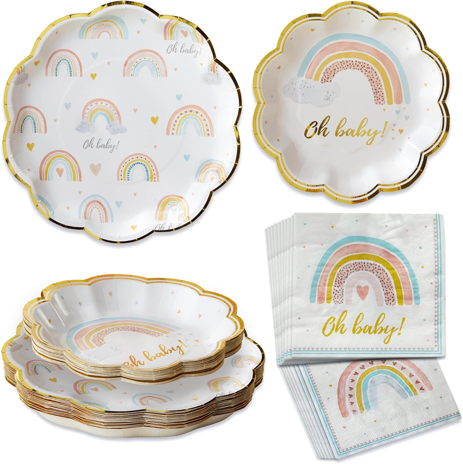 - BEAUTIFUL & FUNCTIONAL - Decorative disposable paper plates with an antique floral print. Rainbow and gold foil details pair these 3 items together for the perfect baby shower theme.