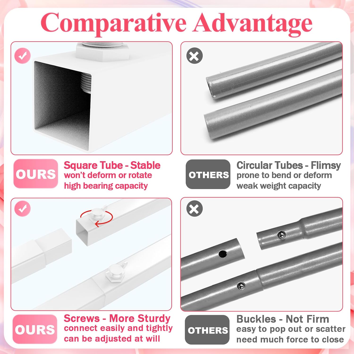 - 【Wedding Arch Frame】This square metal arch backdrop stand is a must-have for your wedding decor. The square arch stand is made of sturdy metallic construction, and its classic square shape will provide you with an amazing background for your party or event. It features square tubes and screw design, laying a solid foundation for your celebration. You can decorate the wedding arch with tulle cloth and vines to create a memorable decoration.
