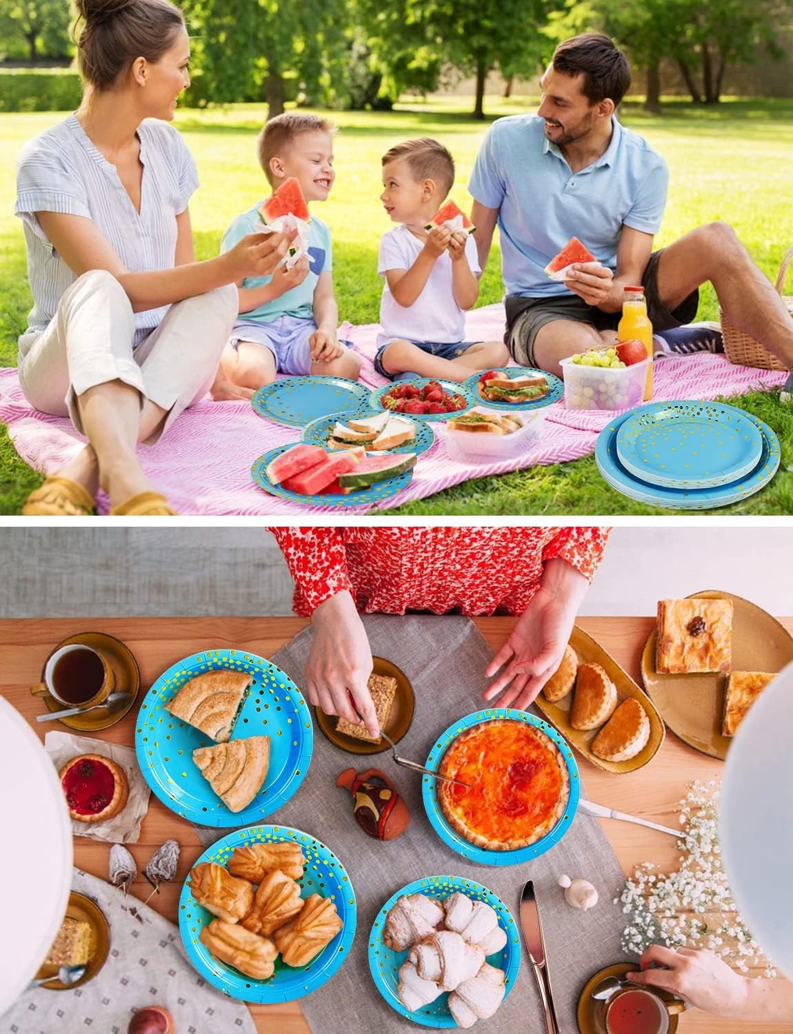 - 🍰【High Quality and Elegant Design】Our party supplies pack features a Sky Blue background and gold foil polka dot pattern, adding a touch of sophistication to your event. Made of 100% food-grade paper, our plates are sturdy and can hold heavy foods without bending or breaking. All party dinnerware are made of BPA-free, non-toxic, and tasteless plastic that is very strong and won't bend or break.