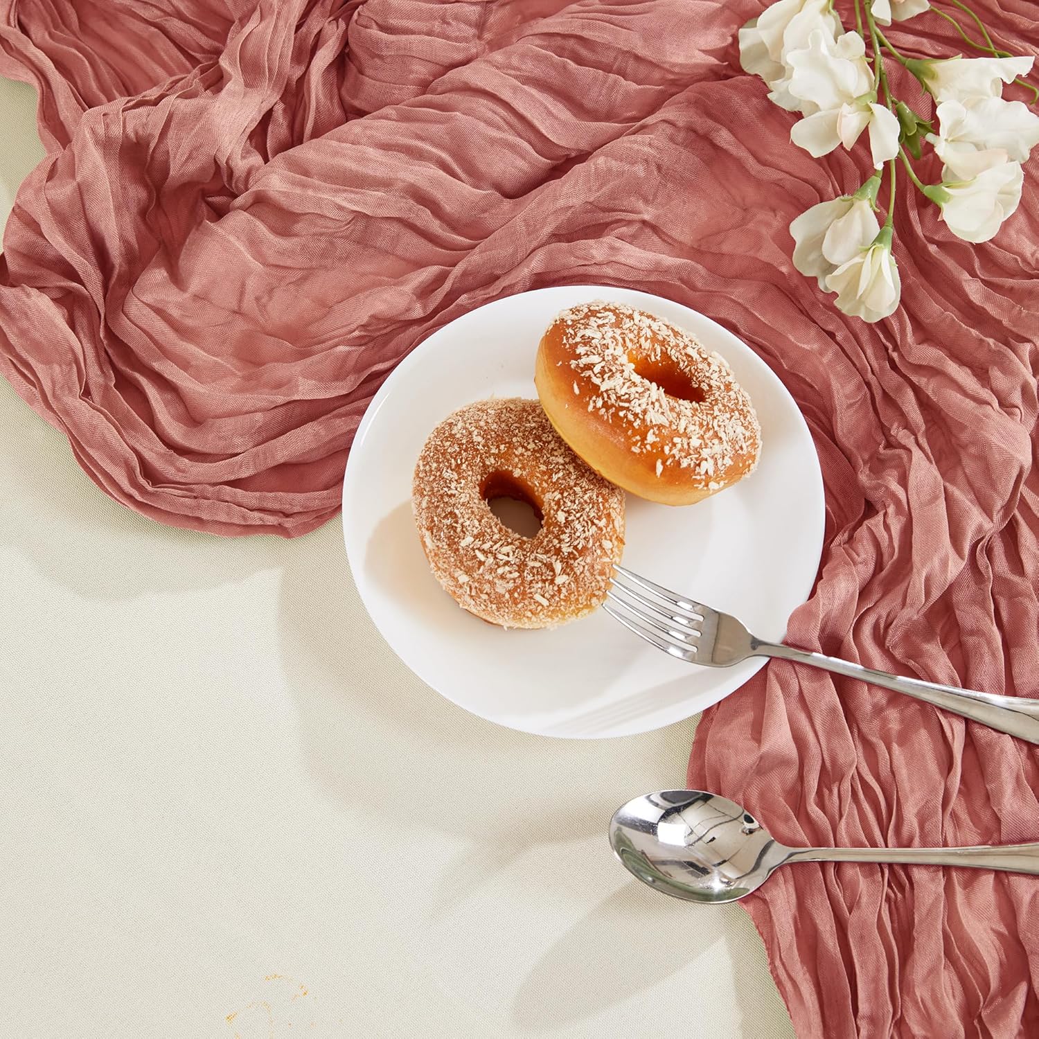 - PACKAGE INCLUDED: You will receive 6 pieces of rose cheesecloth table runners. Elegant and beautiful design, exquisite workmanship. Product size: Each boho table runner is 35 x 120 inches. Enough to cover rectangles and round tables, as well as long tables that are stitched together. It can even be used to belt chairs decorate napkins, background curtains. Round or square tables for 8-10 people, perfect for romantic and elegant party events
