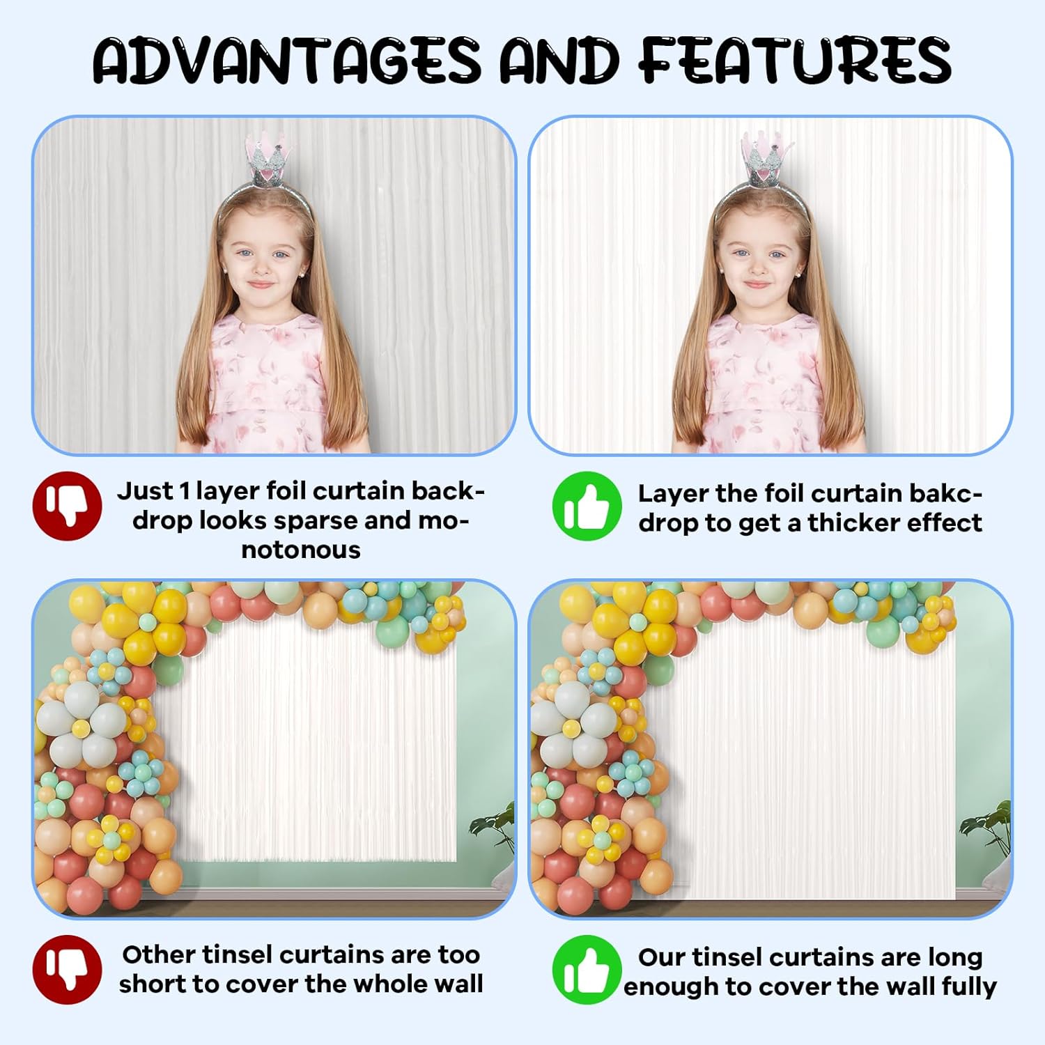 - Eye-Catching Design: These tinsel backdrops boast vibrant colors and a shimmering effect that reflects light beautifully. Your friends will be mesmerized by the captivating atmosphere these curtains create